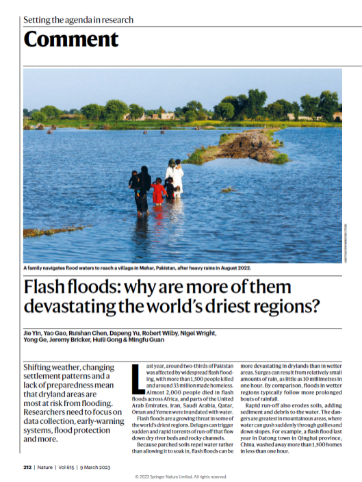 Yin J, Gao Y, Chen R, Yu D, Wilby R, Wright N, Ge Y, Bricker J, Gong H, Guan M. Flash floods: why are more of them devastating the world’s driest regions? Nature, 2023, 615: 212-215.