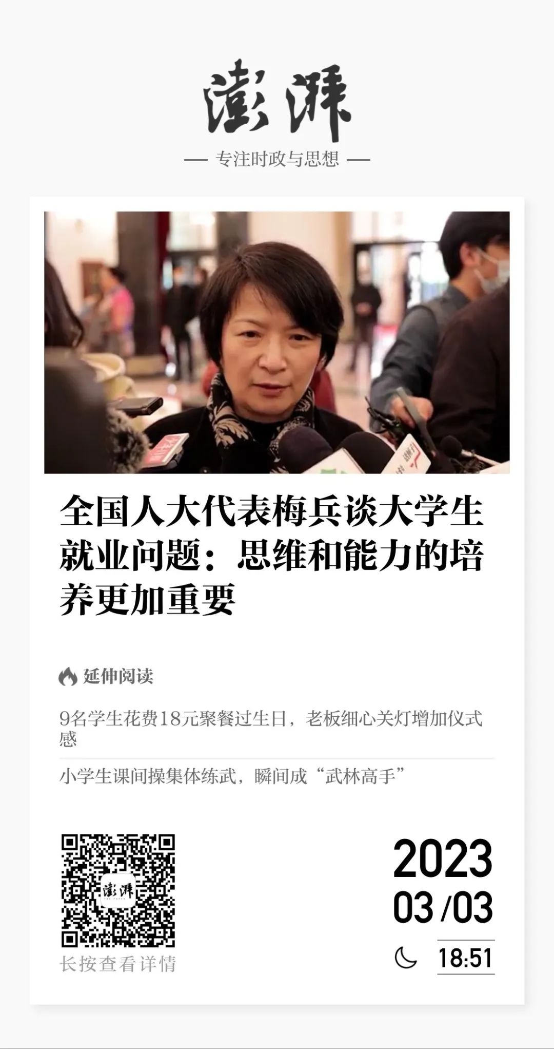 澎湃新闻丨全国人大代表梅兵谈大学生就业问题:思维和能力的培养更加重要