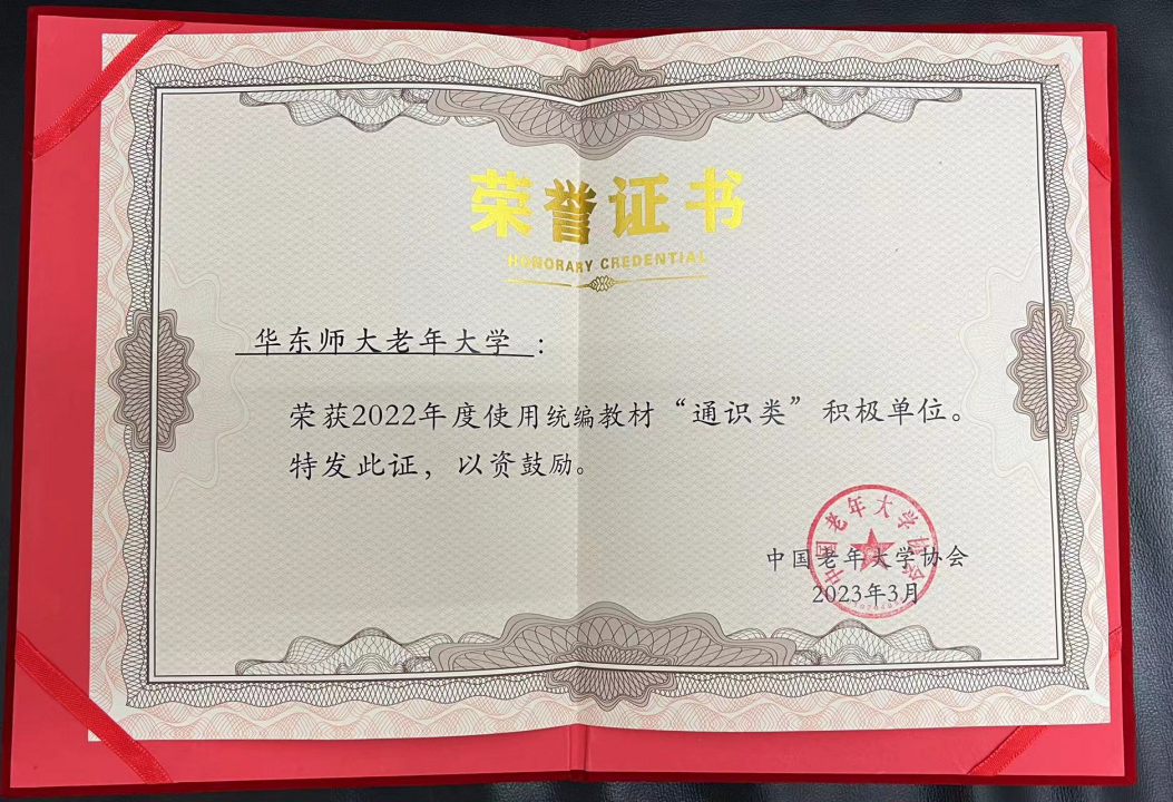 为深入学习贯彻党的二十大精神,落实《中共中央国务院关于加强新时代老龄工作的意见》文件精神,做好老年大学统编教材的编写、审定和推广使用工作,中国老年大学协会于2023年3月召开了中国老年大学协会教材指导委员会第三次全体会议。会上,中国老年大学协会向45个统编教材(通识类)推广使用积极单位、5个统编教材(通识类)优秀组织单位及统编教材(通识类)融媒体创新单位颁发证书。澳门永利皇宫官网入口老年大学荣获“2022年度使用统编教材(通识类)积极单位”荣誉称号,上海仅有华东师大老年大学、上海老干部大学和上海老年大学获此殊荣。