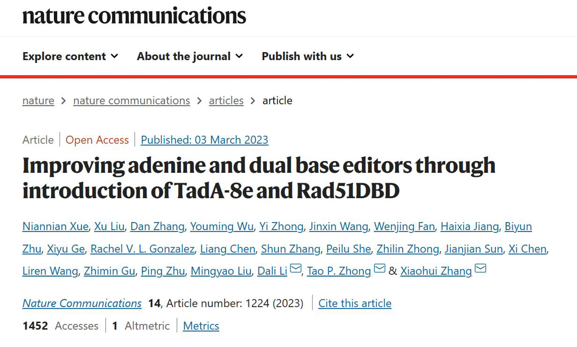 2023年3月3日,澳门永利皇宫官网入口生命科学学院/上海市基因编辑与细胞治疗前沿科学基地张晓辉(现为中国医学科学院苏州系统医学研究所PI)、钟涛和李大力,在《自然通讯》(Nature Communications)杂志上发表了题为“Improving adenine and dual base editors through introduction of TadA-8e and Rad51DBD”的论文。开发了具有超高活性的腺嘌呤单碱基编辑器 (hyABE),极大地提高了靠近PAM区A-to-G的转换效率,扩大了编辑窗口。同时,作者研发了超高活性的嘌呤嘧啶双碱基编辑器(eA&C-BEs和hyA&C-BEs),大幅提高A-to-G和C-to-T(A/C)同时编辑效率,并首次证明在斑马鱼胚胎中具有A/C同时编辑功能,展现了新型腺嘌呤碱基编辑器hyABE在构建点突变疾病模型中的优势。