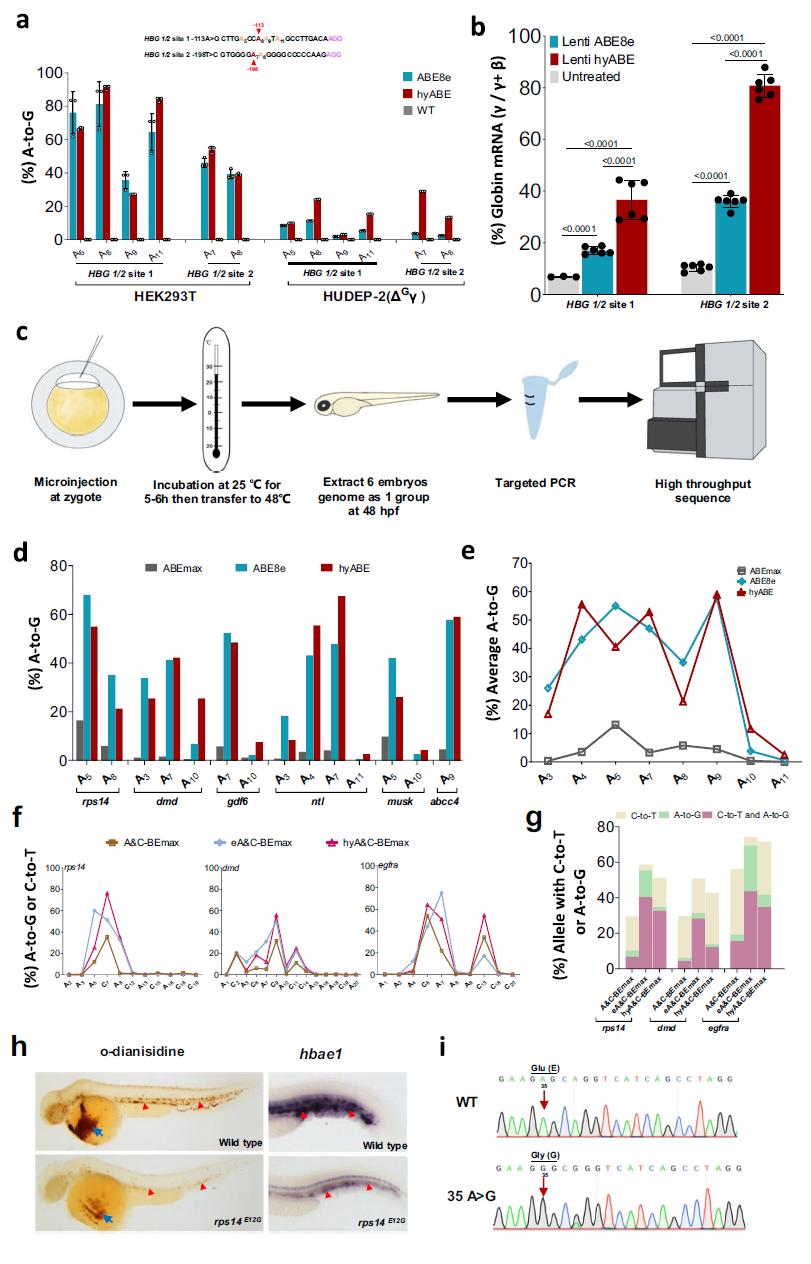 为了构建疾病模型,研究人员在斑马鱼胚胎中试验基因靶点编辑,发现hyABE有效催化A-to-G转换,编辑效率高达60%。惊奇的是,能够在F0胚胎中引入纯合rps14E12G致病点突变,显著降低血红蛋白和红细胞数目,成功构建了血细胞发育异常(MDS)疾病模型,展现了hyABE在构建点突变疾病模型中的优势 。同时,证明双碱基编辑器eA&C-BEs和hyA&C-BEs在斑马鱼胚胎中具有较高的A-to-G和C-to-T同时转换效率。这些碱基编辑器的应用并没有引起斑马鱼胚胎发育致畸表型。作者进一步将hyABE应用到b-血红蛋白病的基因治疗中,将其递送到红细胞前体细胞中(HUDEP-2),创建新的转录激活因子GATA1结合位点(-113 A>G)以及新的KLF1/EKLF结合位点(-198 T>C),重新激活γ-globin的表达,提供潜在的基因治疗新策略。