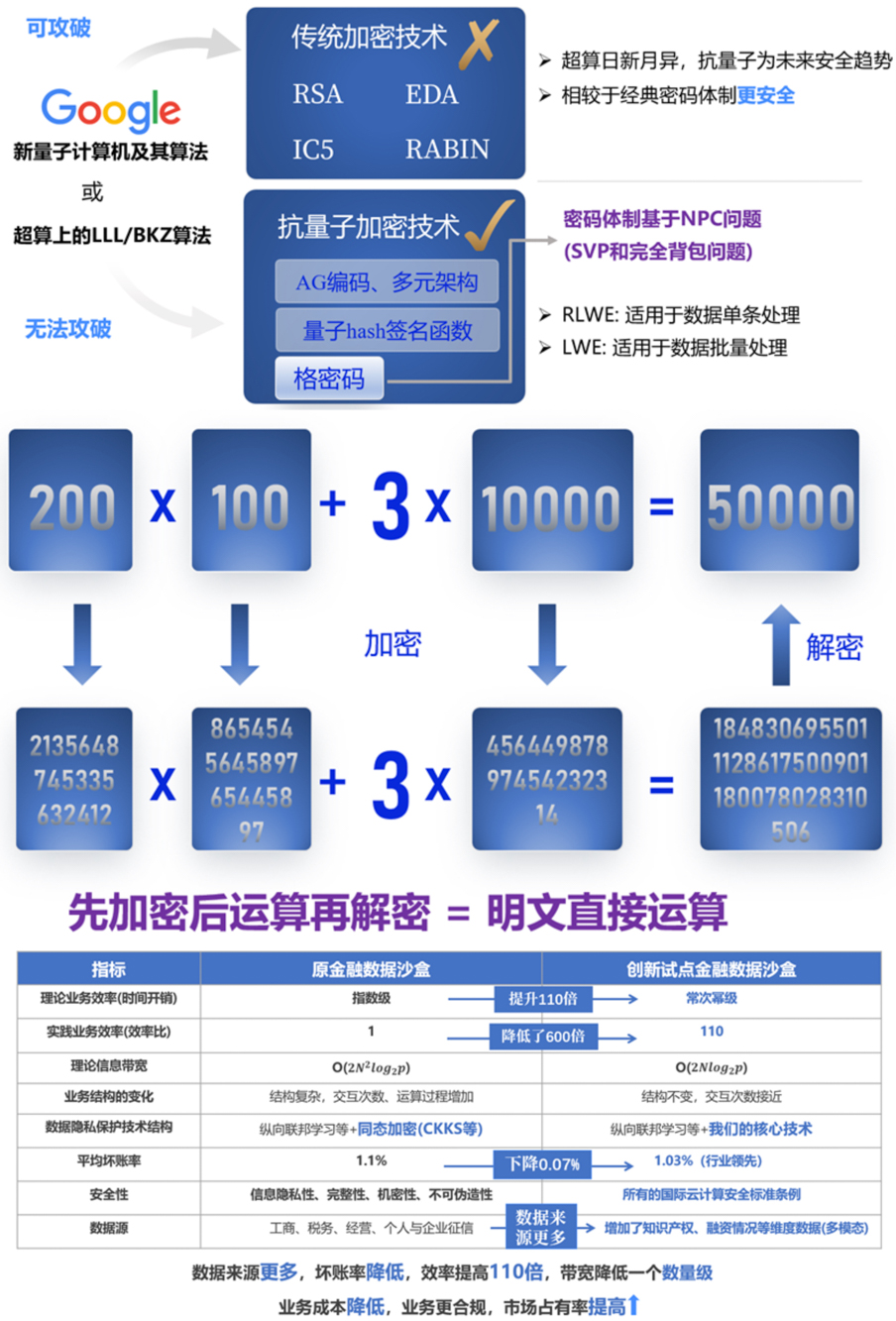 针对难点1,作品打通了数据孤岛,加强了数据维度可得性,扩张了主征信源数据;针对难点2,作品基于独家的抗量子加密技术,提升了产品安全性,降低了成本开销,并且降低了银行坏账率,实现企业、银行的双赢。作品通过金融科技手段,为因数据不足导致融资难以过审的小微企业,提供出一种创新性解决方案。