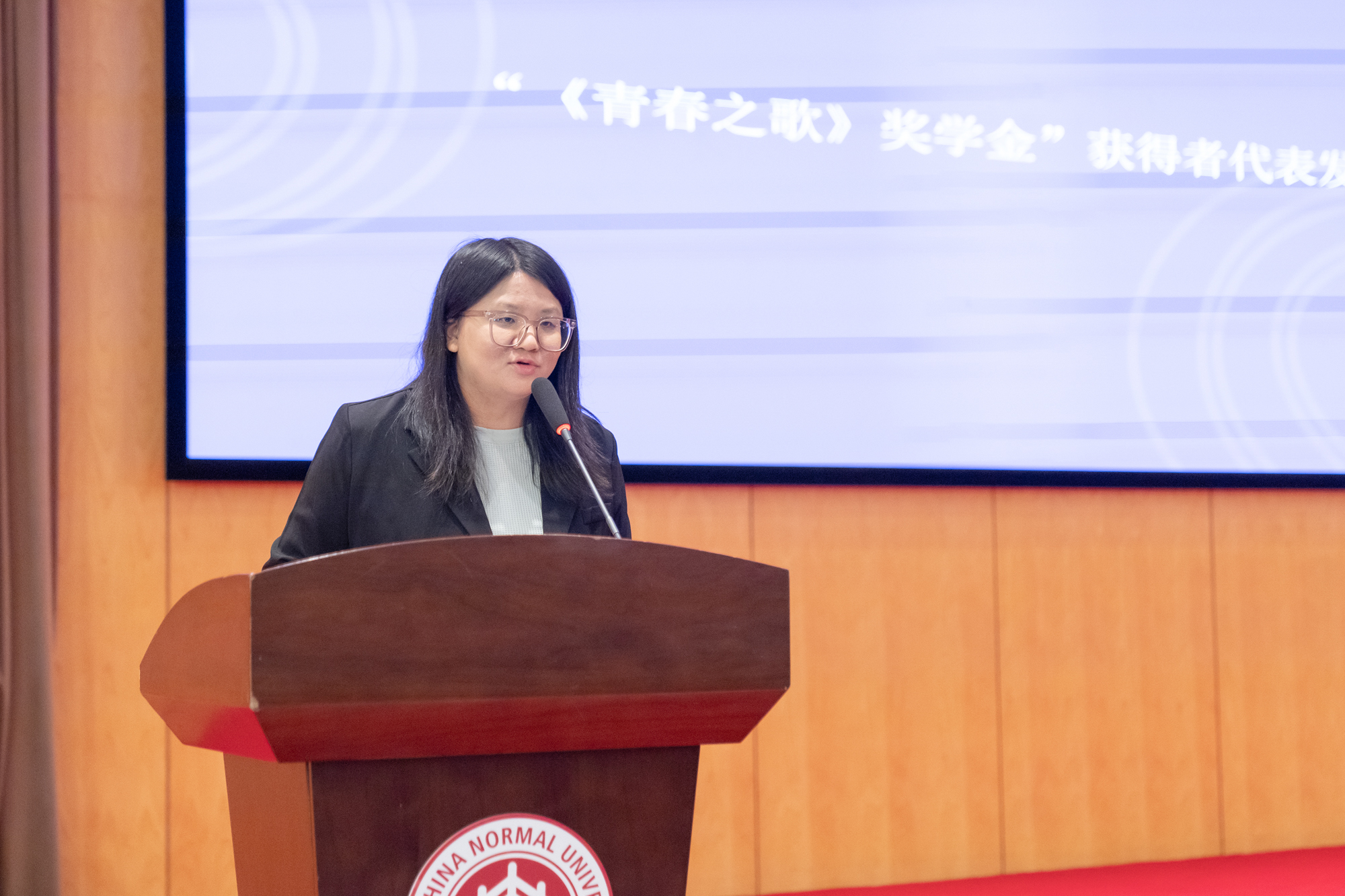 李敬泽、格非、李洱、王宏图四位嘉宾为“《青春之歌》奖学金”获得者代表颁发证书。澳门永利皇宫官网入口创意写作专业三年级硕士生水笑莹作为获得者代表发言,在发言中感谢大奖的激励与创意写作专业的培养。