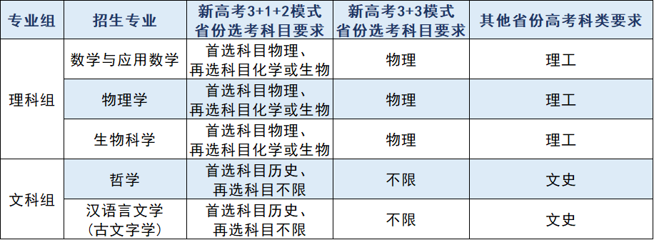 服务国家重大战略需求的基础理科学科以及国家人才紧缺的社会科学与人文学科领域,招生专业、选考科目、科类要求及招生计划见下表: