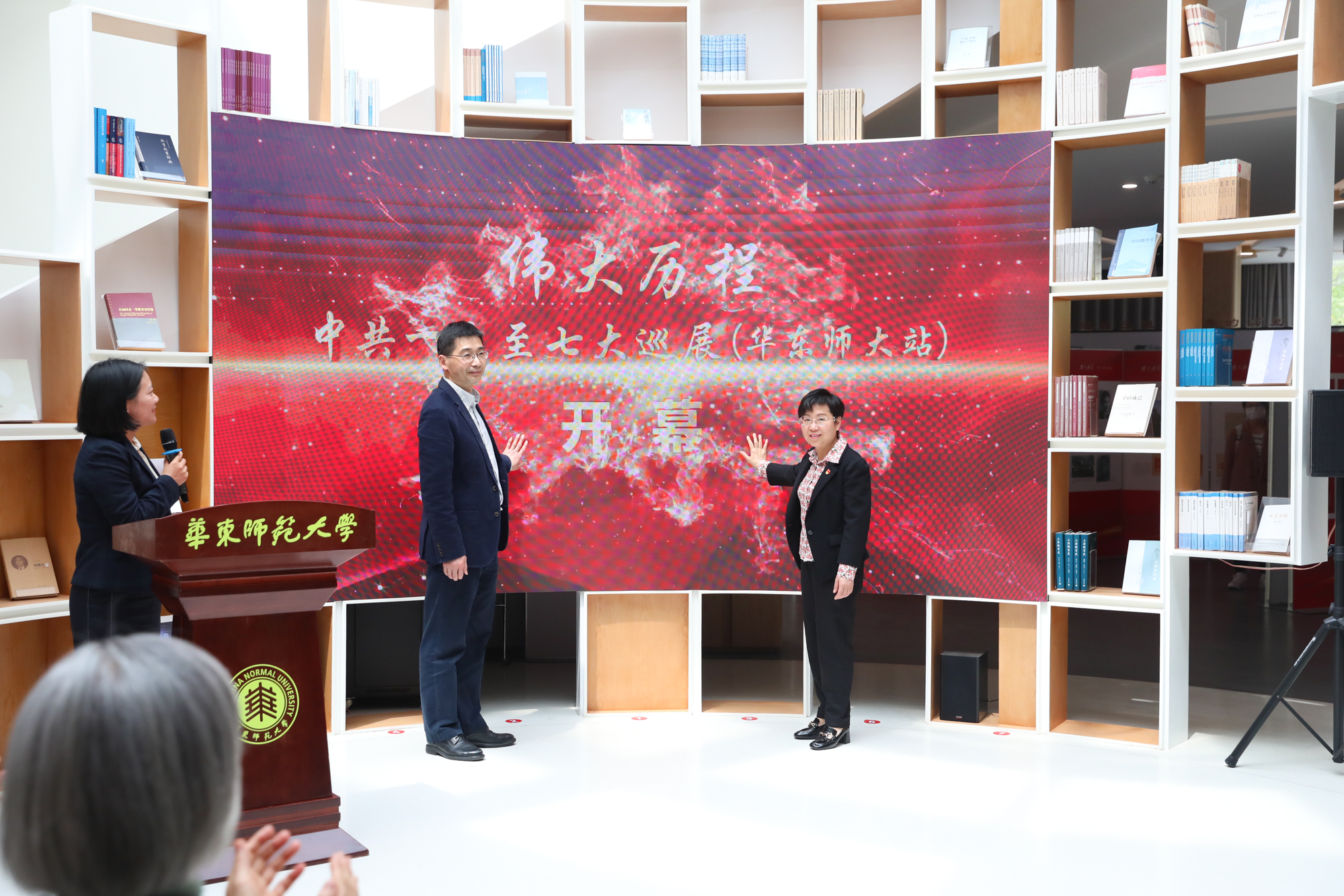 在开幕仪式上,严爱云、顾红亮为“伟大历程——中共一大至七大巡展(华东师大站)”揭幕。