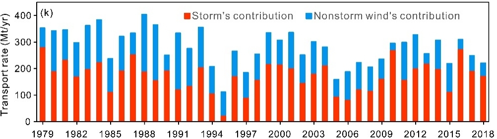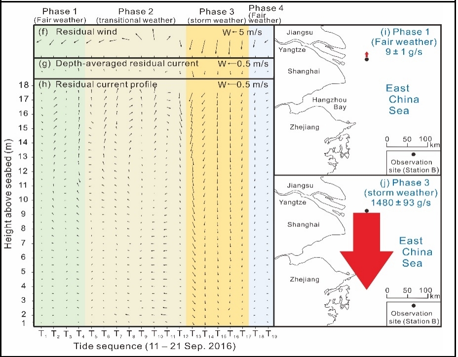 该团队的研究表明:风暴驱动的长江水下三角洲泥沙再悬浮和向南输运不仅发生在冬季,也发生在其他季节;风暴事件(平均出现频率约5%)在各年向南总输沙量中的贡献率变化于23%和92%之间,平均约62%(1979–2018年);仅2016年9月的一个Malakas台风事件就导致约0.63亿吨泥沙从长江三角洲向南运移,相当于多年平均年输沙率的四分之一;风暴事件是2003年三峡水库蓄水运行以来长江水下三角洲出现净侵蚀的主要驱动机制。研究指出,上述现象的关键机制是:1)风暴沿岸分量中往往以向南分量占绝对优势(多年平均86%);2)风暴通常形成强浪,导致大量泥沙再悬浮,并引起强劲的向南沿岸余流,结果导致巨量泥沙向南输运。在此基础上,团队提出了长江入海泥沙向南运移的概念模型。该研究为三角洲侵蚀及泥沙沿岸输运驱动理论的深化提供了新的视角。