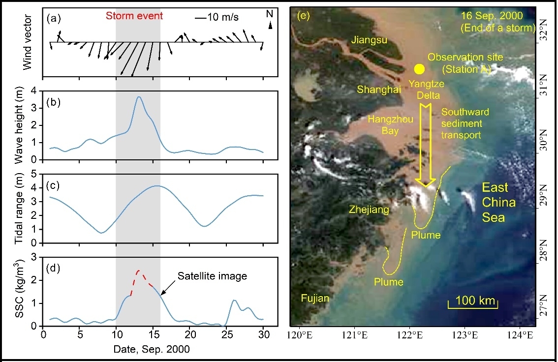 沿岸输运是海岸泥沙运动的主要形式之一。传统理论通常认为,东亚冬季风是导致长江水下三角洲泥沙向南输运并形成长约一千公里浙-闽泥质带的原因。然而,风暴(尤其是台风)在该过程中的作用却鲜有报道。华东师大河口海岸学国家重点实验室杨世伦教授带领的中国、荷兰、美国合作团队发现风暴是长江水下三角洲侵蚀及泥沙向南输运的主要驱动力,该成果以“Storms dominate the erosion of the Yangtze Delta and southward sediment transport”为题近日在线发表于 Science Bulletin 。