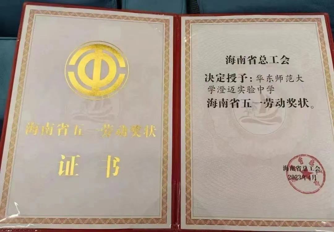 近日,在2023年海南省五一劳动奖和海南省工人先锋号表彰大会上,华东师大澄迈实验中学被授予“海南省五一劳动奖状”。