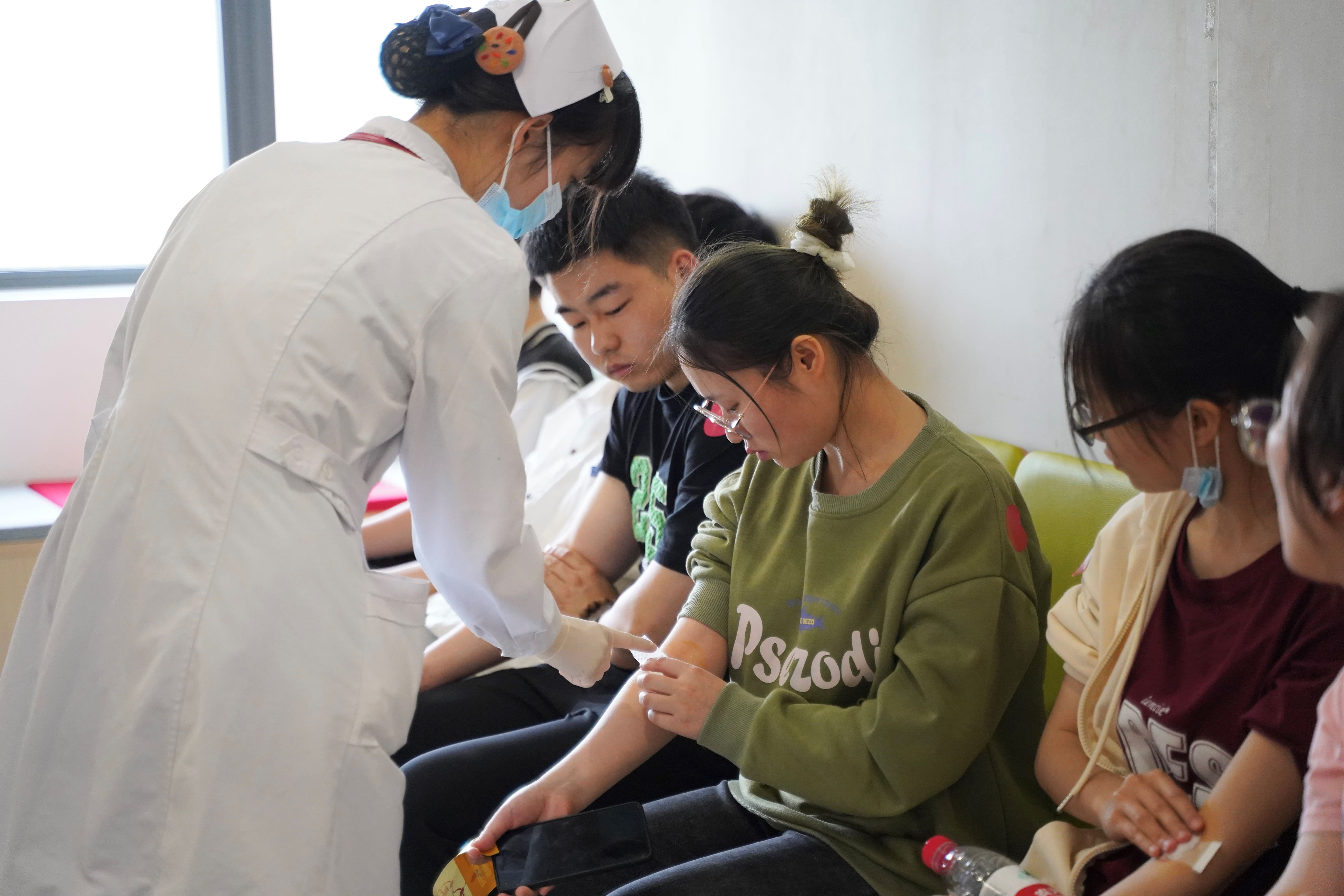校医院的医务人员和志愿者们,热心为师生们介绍献血流程,叮嘱献血注意事项、贴心端送红糖水;耐心安抚献血前紧张的同学;帮献血的同学拿东西并护送到休息区,将汗水融化成满脸笑容,温暖了前来的每一位献血者。