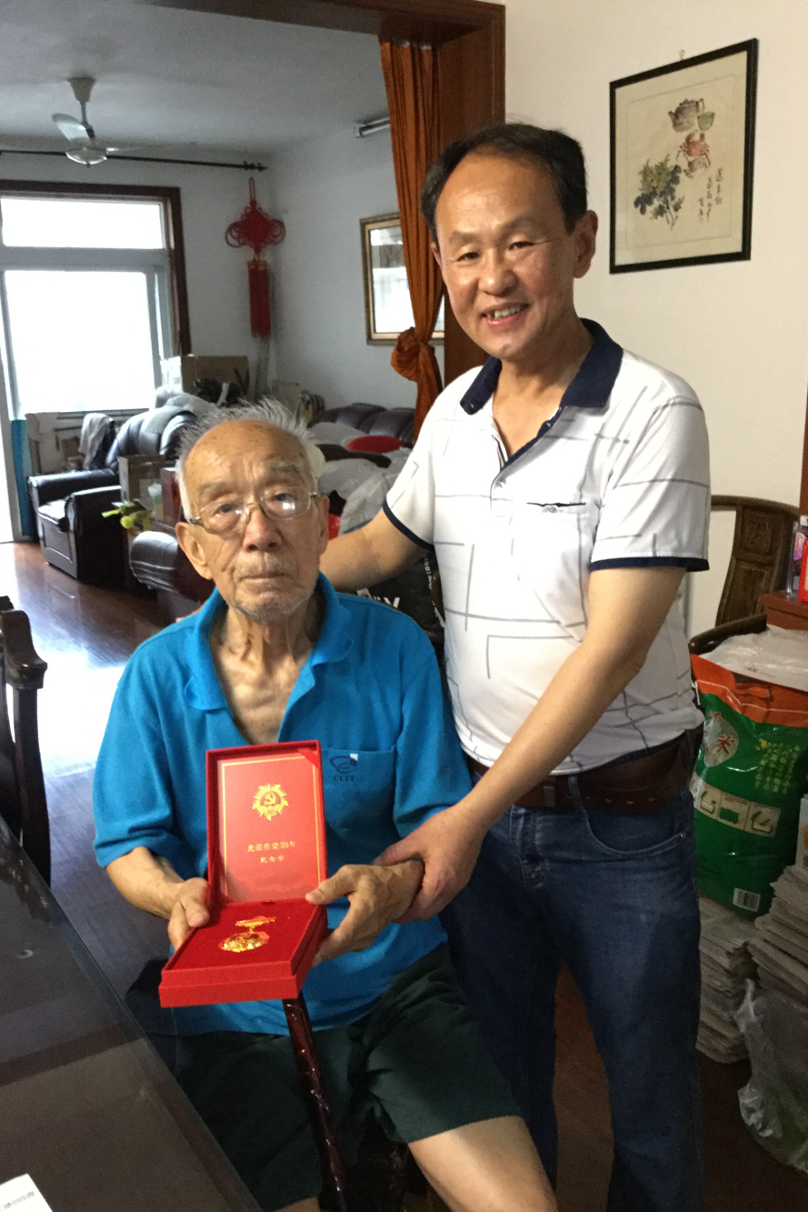 2021年6月,于纪渭从退休教工党支部书记苏尚手中接过光荣在党50年荣誉纪念章
