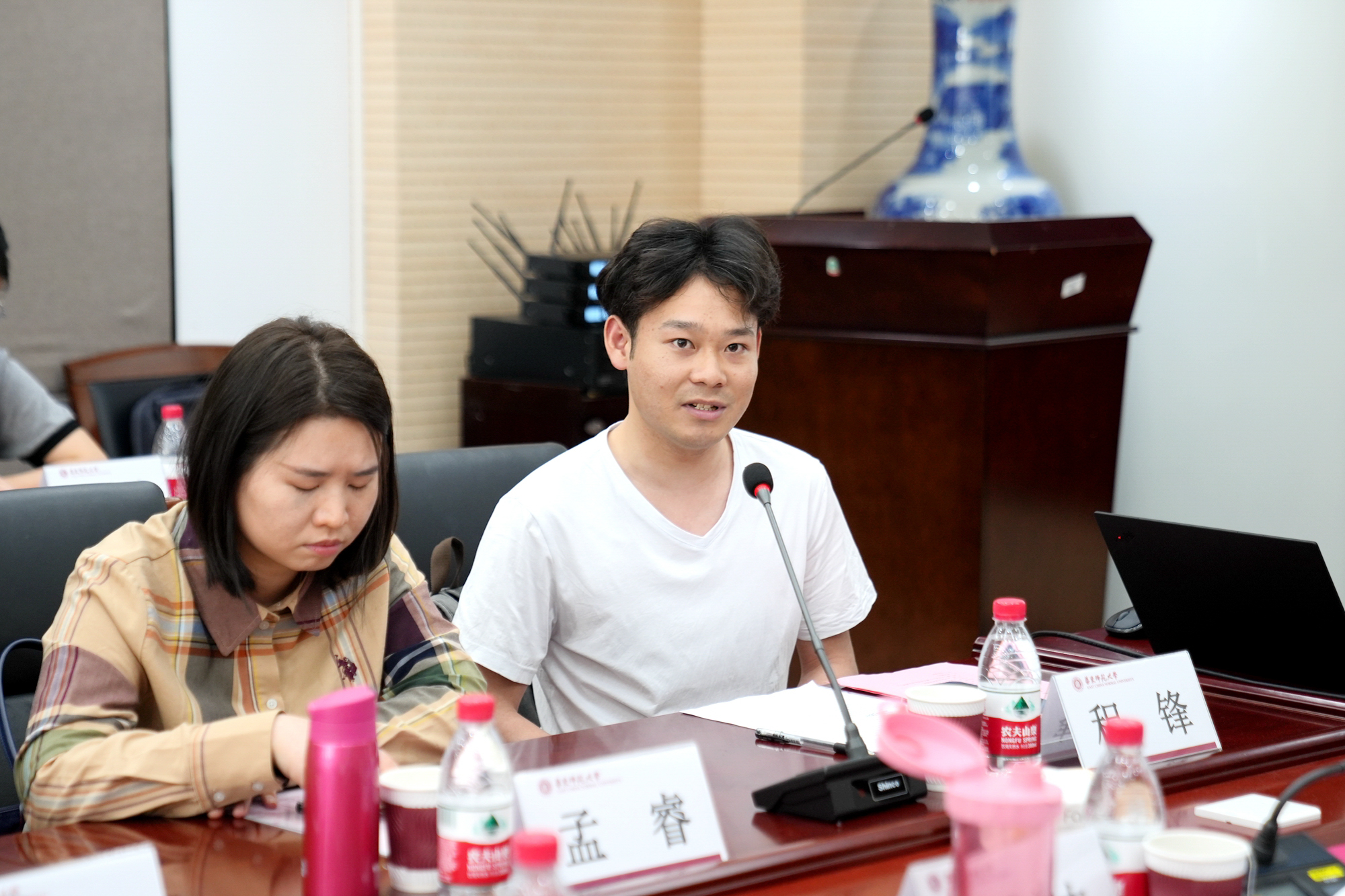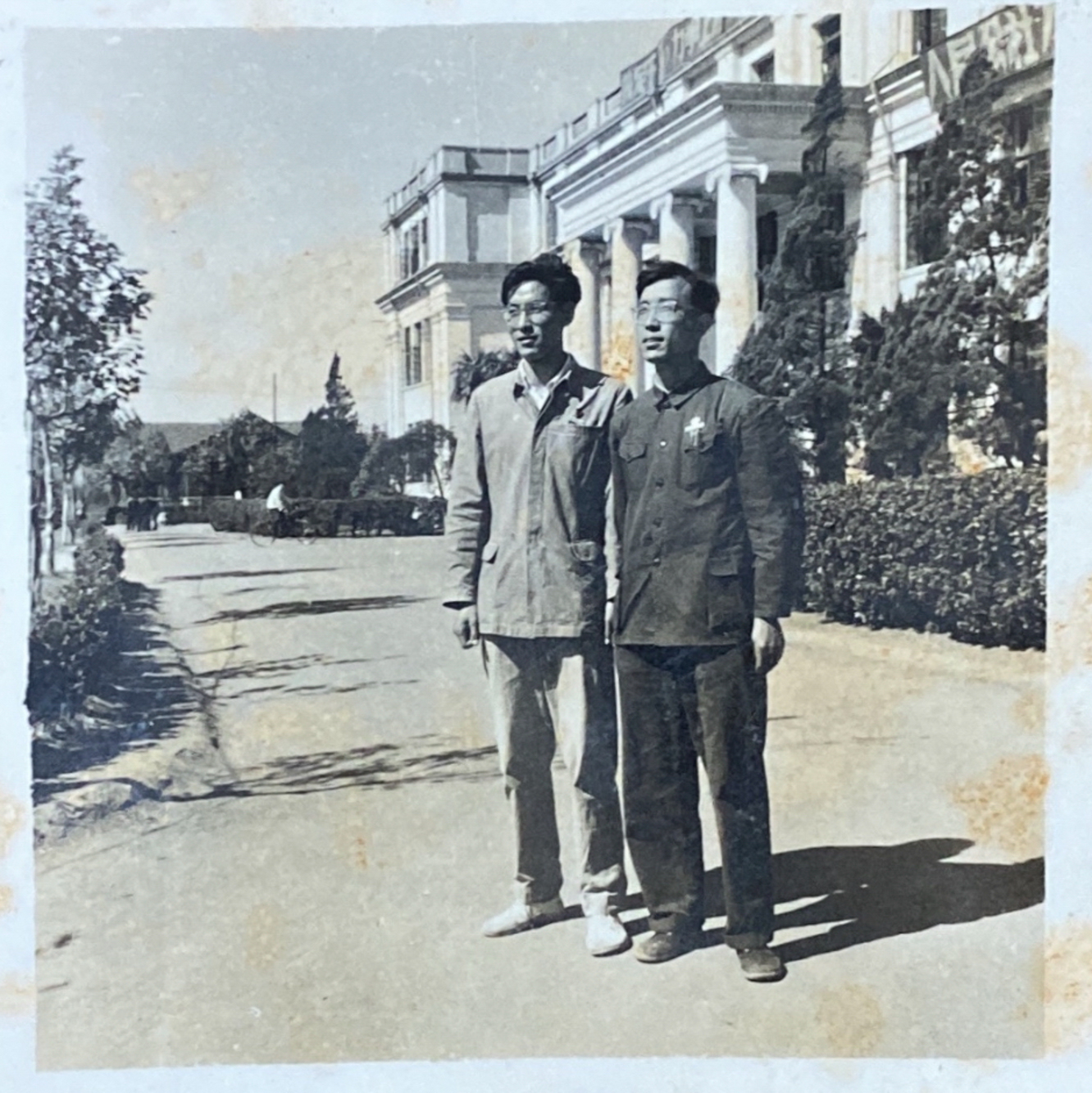 于纪渭(右)在普陀校区群贤堂前