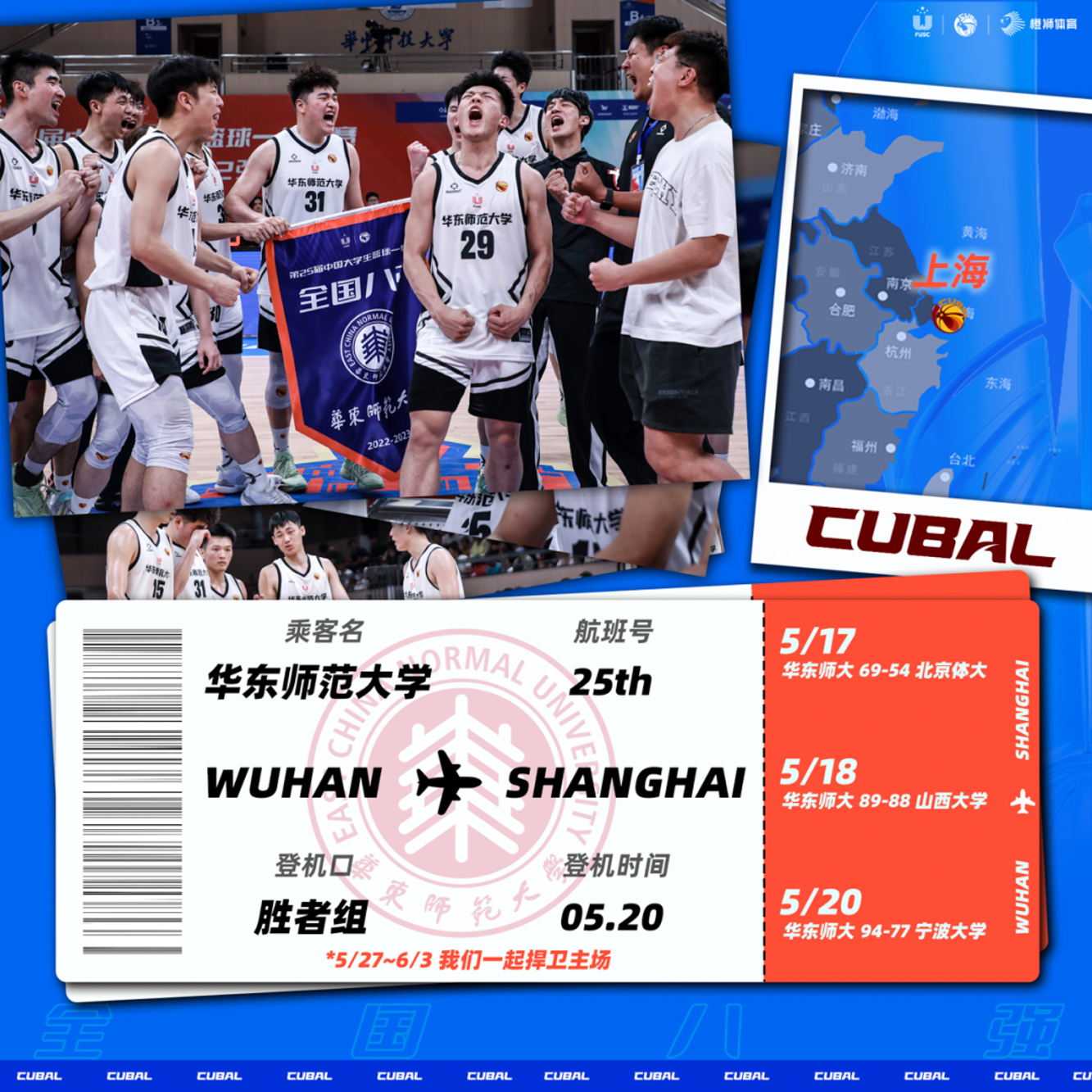 在25届CUBAL中国大学生篮球联赛男子一级联赛全国赛上,华东师大男篮一路过关斩将,以94:77战胜老对手宁波大学男篮,拿到了本届比赛第一张全国八强的门票,成功将比赛带回主场,创造队史最佳战绩!祝贺!为华东师大男篮点赞!
