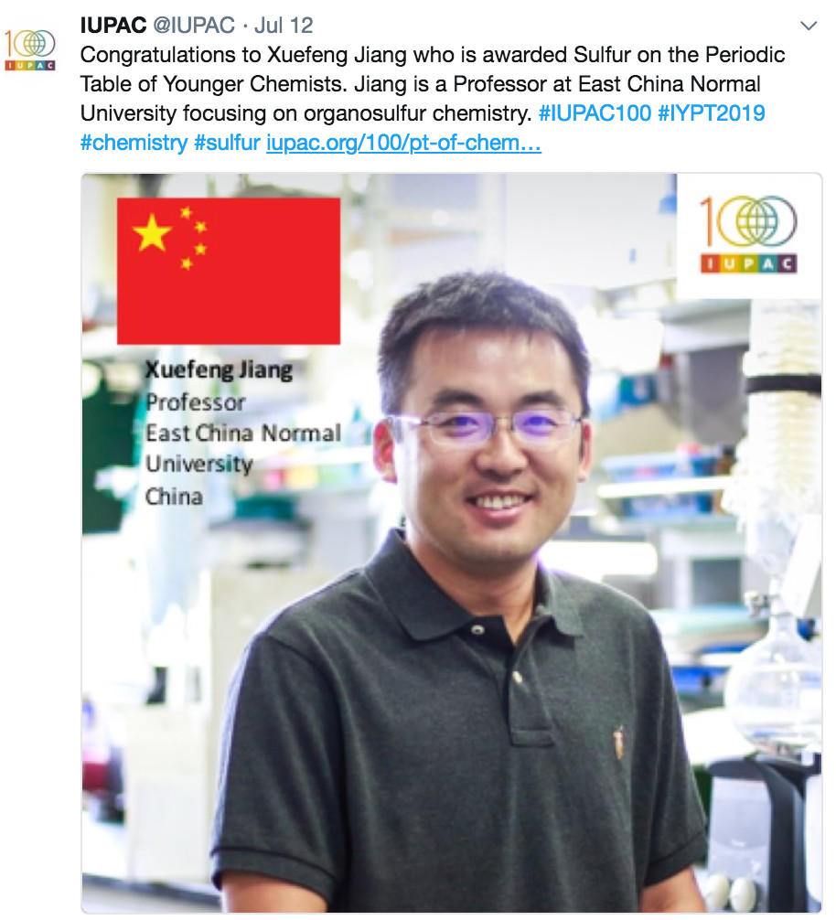 2018年,姜雪峰教授被IUPAC遴选为硫元素“代言人”
