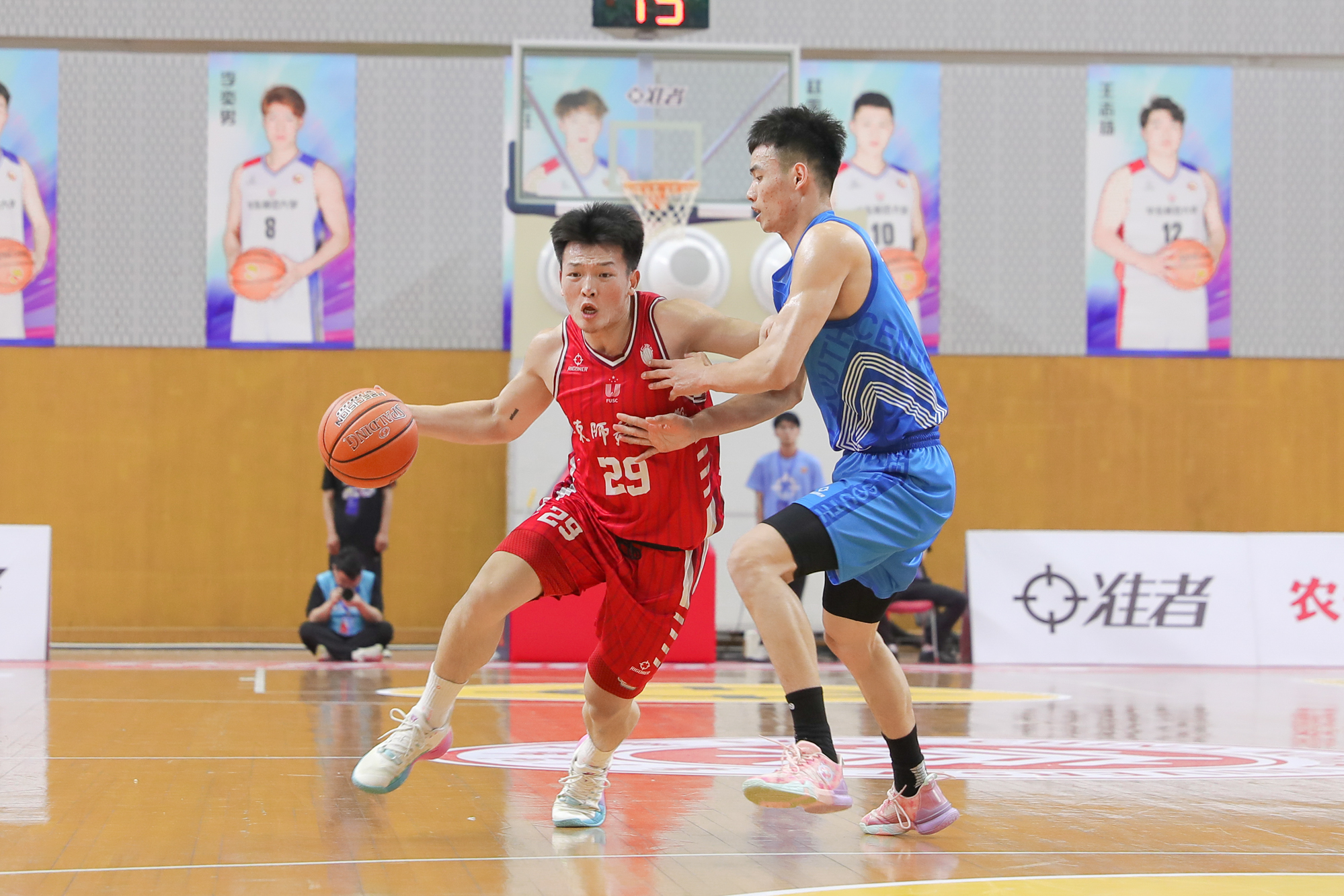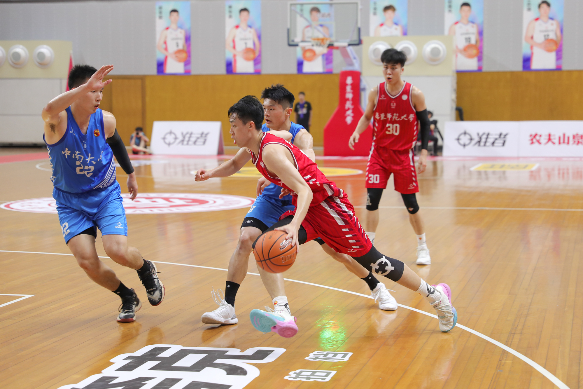 暂停过后,华东师大男篮逐渐找到比赛状态,杨东在双人包夹下将球强硬放进,带领球队吹响进攻号角。29号丁超三分命中,15号李政崇中距离得手,中南大学男篮则继续依靠外线发威。