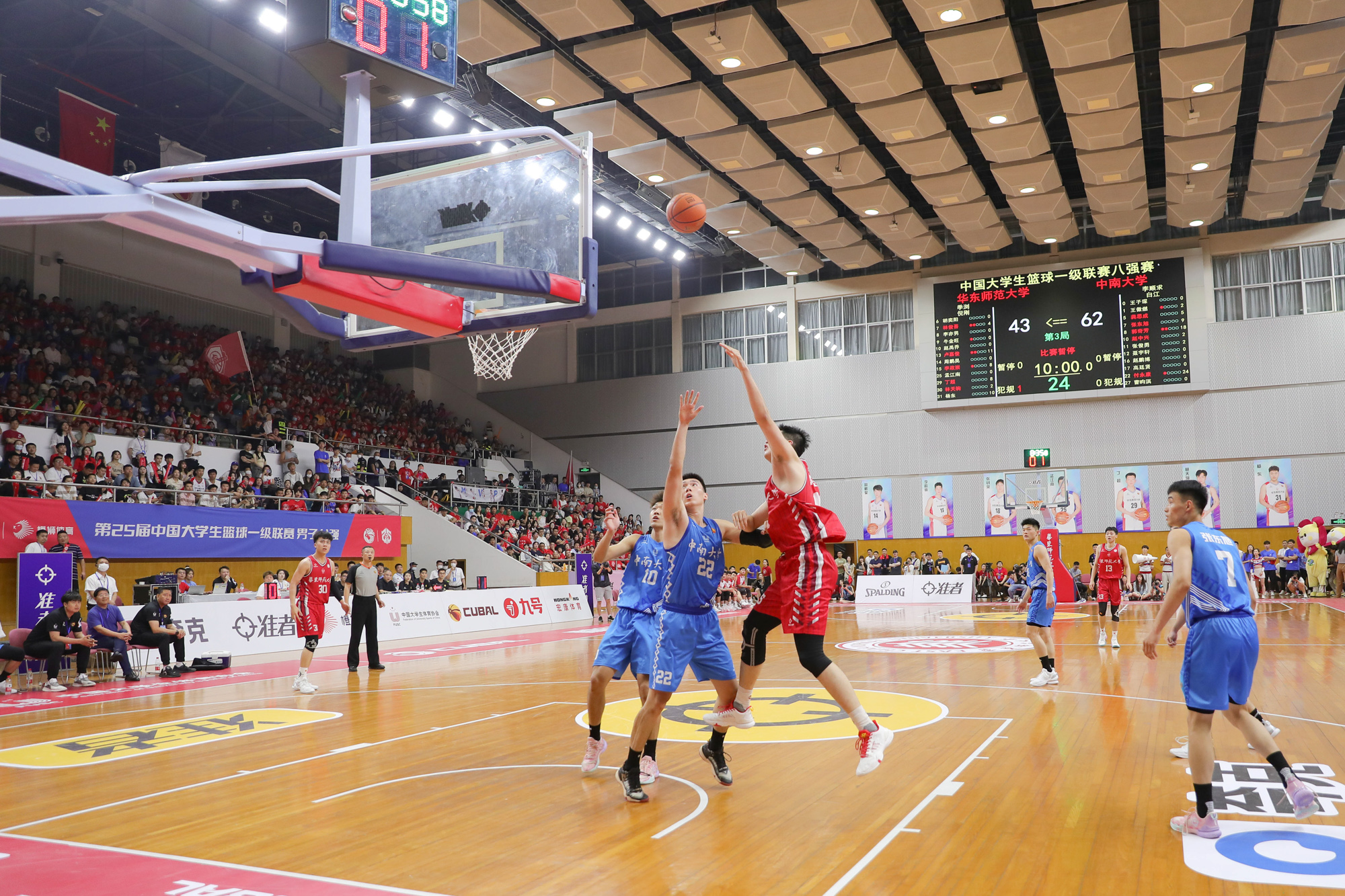此节末端,华东师大男篮体力下降,投篮命中率下降,对手则在外线火力不减。三节战罢,华东师大男篮55:80中南大学男篮。