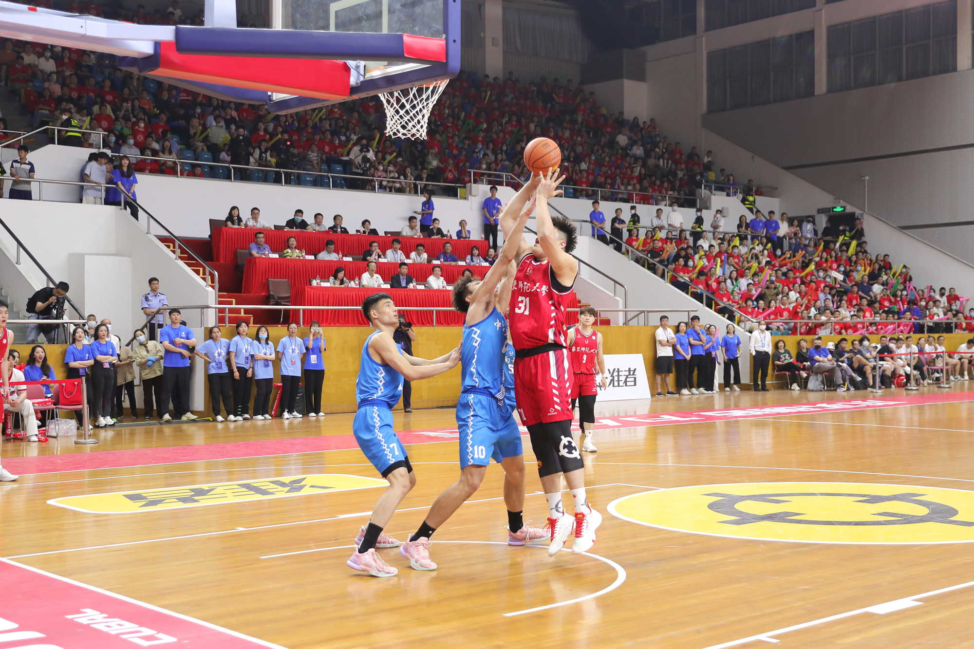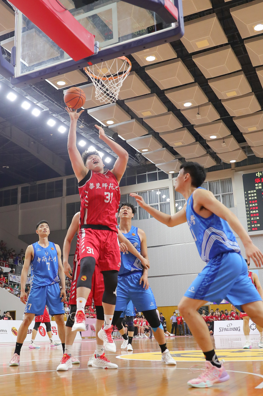 本节比赛,华东师大男篮防守端明显加强,篮板球方面也占据主动。李政崇和杨东在内线翻江倒海接连得分,华东师大男篮保持进攻火力。