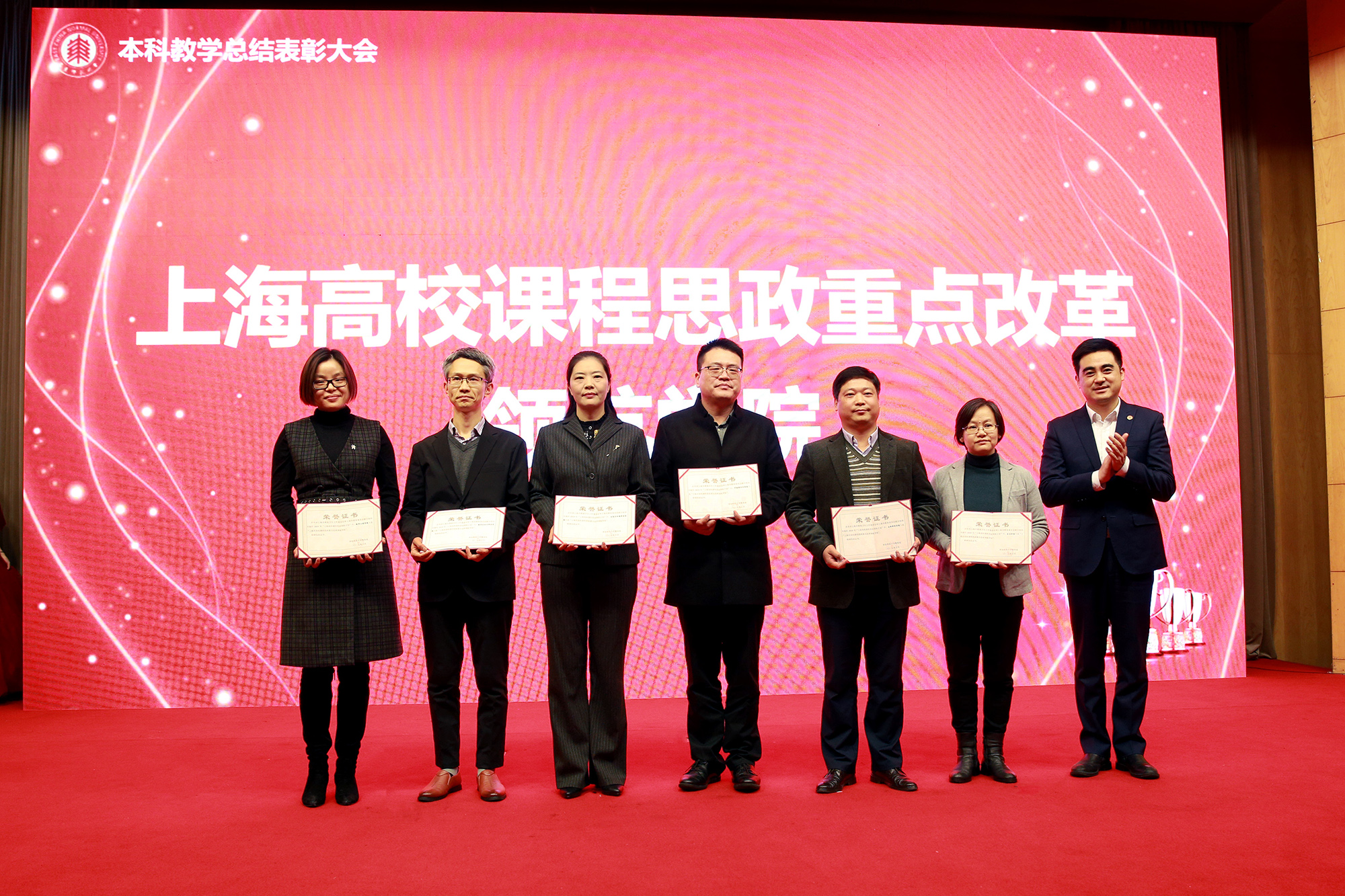 大会表彰了我校入选上海高校课程思政领航计划的上海高校课程思政重点改革领航学院。在我校入选上海高校课程思政整体改革领航高校的同时,我校中国语言文学系、历史学系、生态与环境科学学院、生命科学学院、软件工程学院、物理与电子科学学院6个院系入选上海市课程思政领航学院。校党委常务副书记王宏舟为学院代表颁奖。