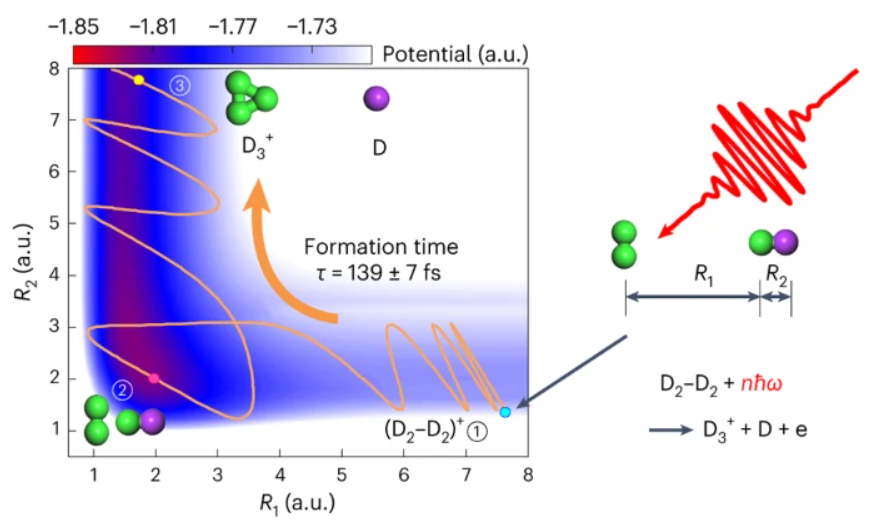H3+及其同位素作为最简单却最重要的星云化学反应始作俑者,一直受到研究人员的广泛关注。氢气分子在宇宙辐射的作用下,发生电离产生氢气离子并进一步与中性的氢气分子发生反应,H2++H2→H3++H,从而形成H3+。H3+能够触发或催化一系列包括形成有机分子和水分子等对宇宙和生命起源具有重要意义的星际化学反应。因此,H3+也被视为星际化学反应链的起点。然而,此前的工作大多关注对该反应过程中的能量转化的研究,而忽略了化学反应本征时间尺度的超快动力学过程。