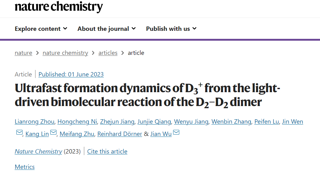 华东师大吴健教授团队近期在双分子光化学反应动力学时域观测与相干调控研究取得重要进展。该团队利用飞秒激光脉冲与D2-D2二聚体相互作用,成功测量了D3+的形成时间并实现了其出射方向的调控,揭示了自然界中最基本的分子-分子之间化学反应的内在机理。研究成果以“Ultrafast formation dynamics of D3+ from the light-driven bimolecular reaction of the D2-D2 dimer”为题,2023年6月1日发表在Nature Chemistry。