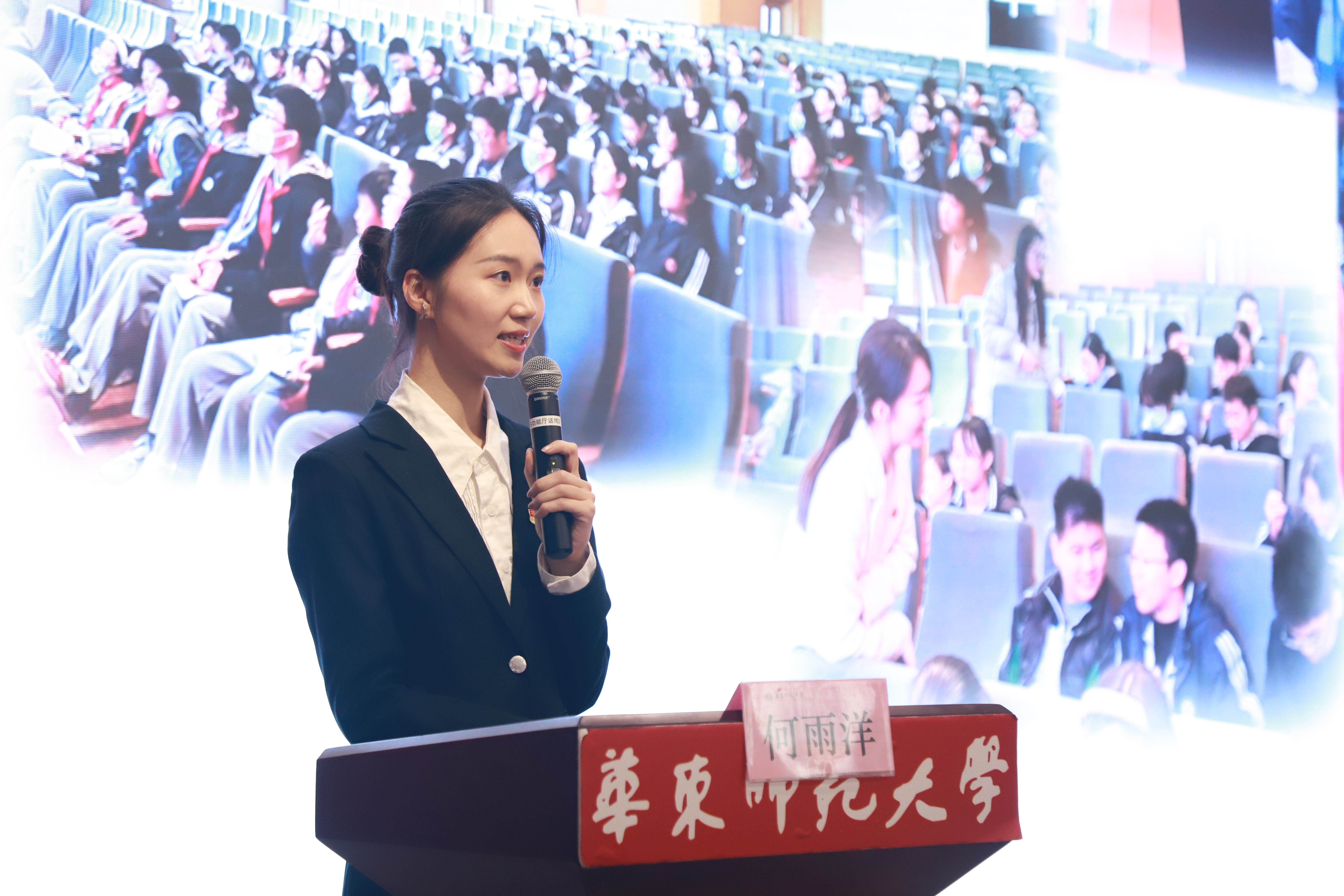 上海高校“百个学生样板党支部”哲学系硕士研究生第一党支部书记何雨洋作题为《融入时代显初心,志愿服务担使命》的报告,从冯契学术成就陈列室的建设历程展开汇报分享。作为红色故事的讲述者,濡染在先生的“化理论为方法,化理论为德性”的导言之中,支部党员们把专业知识融入社会实践,积极到各级各类学校进行宣讲并开展国学智慧教育活动,致力于推进大中小学思想政治教育一体化建设。