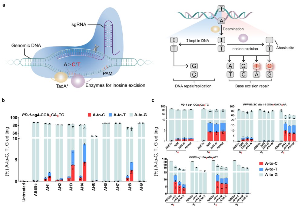 人类的遗传疾病主要由基因突变造成,并且约58%为单碱基突变(SNVs)【1】。目前,不依赖DNA双链断裂和模板参与的单碱基编辑器(baseeditors)是治疗遗传病强有力的基因编辑工具。现有的碱基编辑技术CBEs(C-to-T),CGBEs(C-to-G), GBEs(C-to-G/C-to-A)和ABEs可实现胞嘧啶转换/颠换编辑以及腺嘌呤的转换突变,由于缺少切除肌苷的内源DNA糖苷酶,ABEs的产物纯度可达99%【2-5】。然而,仍有25%的人类单碱基突变遗传疾病需要精准的腺嘌呤颠换编辑(A-to-C或A-to-T)才能纠正,因此开发高效精准的腺嘌呤碱基编辑器具有重要意义。