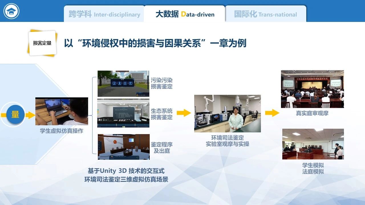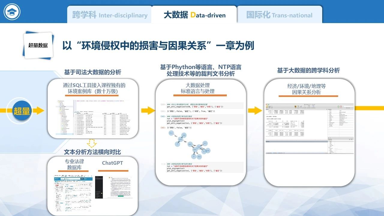 再如,在“环境侵权中的因果关系”一节,一方面,学生通过生态环境损害司法鉴定虚拟仿真平台,借助真实案例进行任务驱动式学习和反复训练,从而直接了解生态环境损害司法鉴定及所涉的科学事项和程序法事项;另一方面,学生学习如何通过自然语言处理方法,将司法判决书等非结构化文本结构化,并通过定量分析,寻找司法判决中因果关系认定的行为规律。