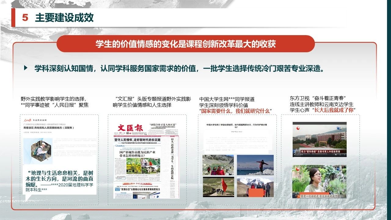 课程团队变革仅以“名山大川”地理典型景观认知为主线组织野外实习的模式,以地理学服务“大战略规划、大工程选址、大生态治理”等主题导向牵引实习教学改革,构建超越知识点的教学。
