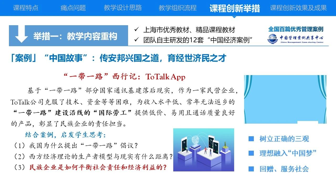 针对课堂师生互动少、学生学习较被动的痛点,课程团队通过教学资源构建,结合智慧教学和移动社交平台,打造“自主预练—吸收内化—实践强化”学习闭环,为学生提供个性化学习服务与支持。基于课程团队自主开发的中国经济案例,采用“以学为中心”的翻转课堂,丰富课程“打开方式”;创设课程实验与圆桌论坛,激发学生求知欲望,培养创新思维能力。