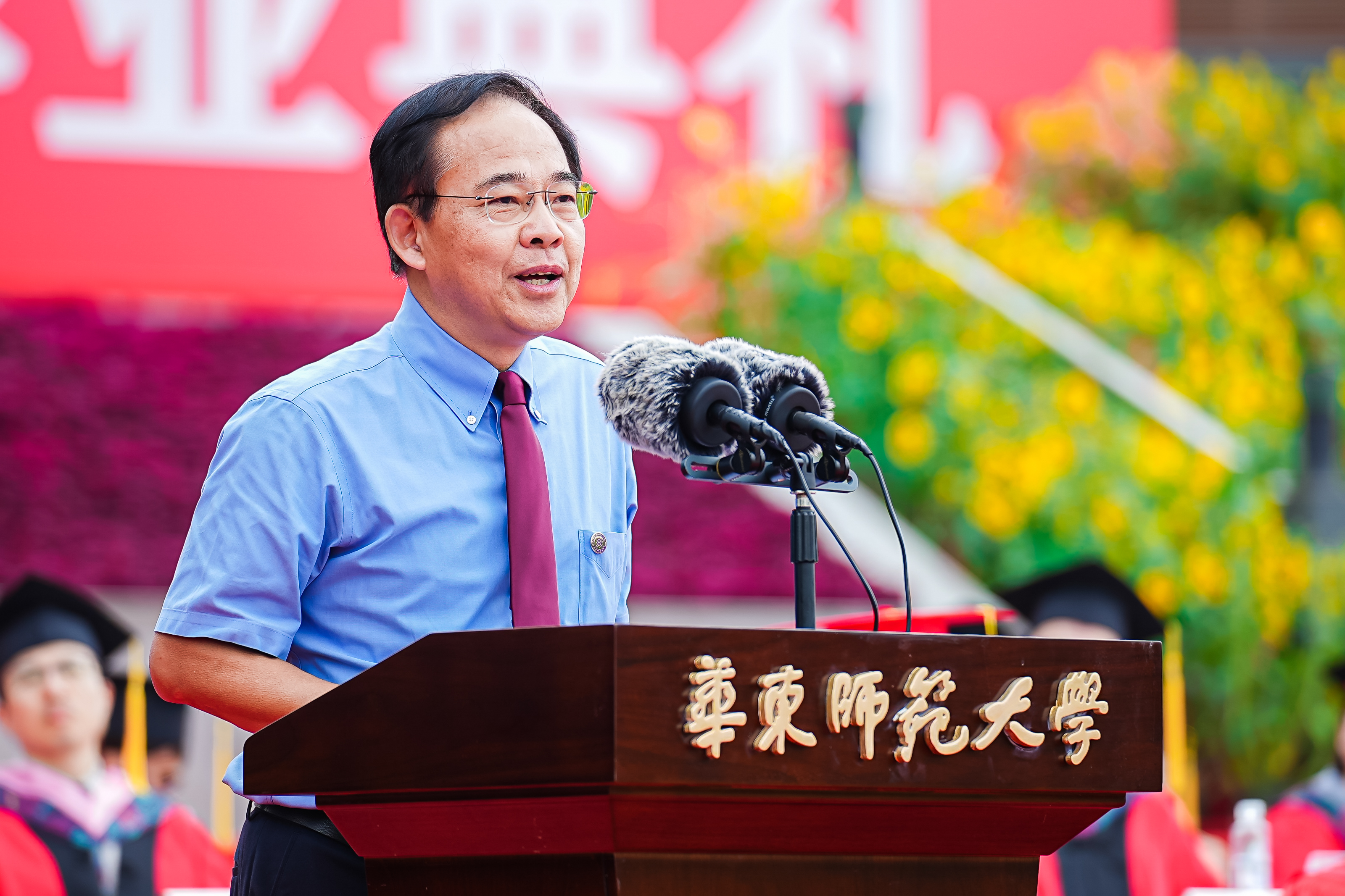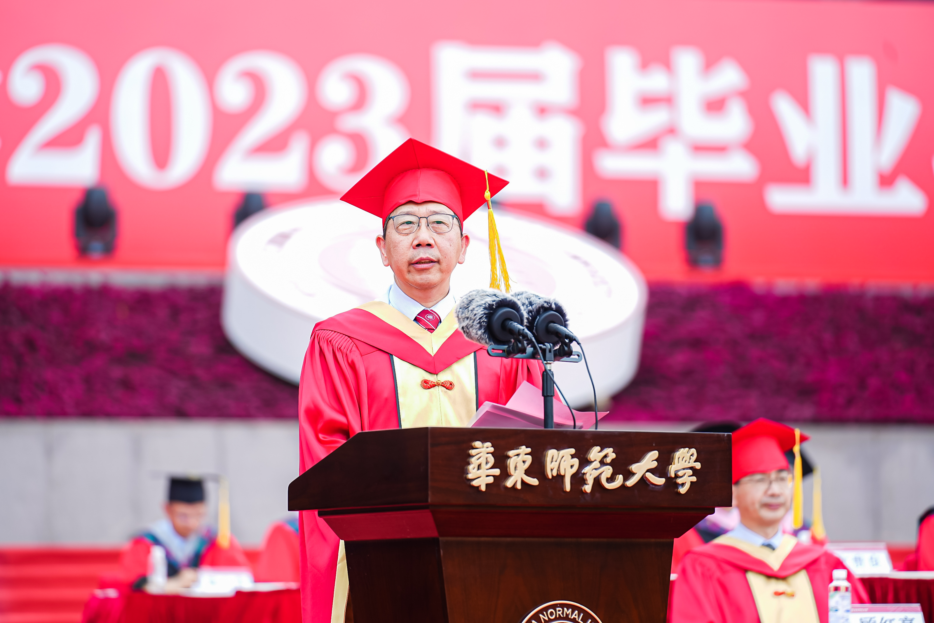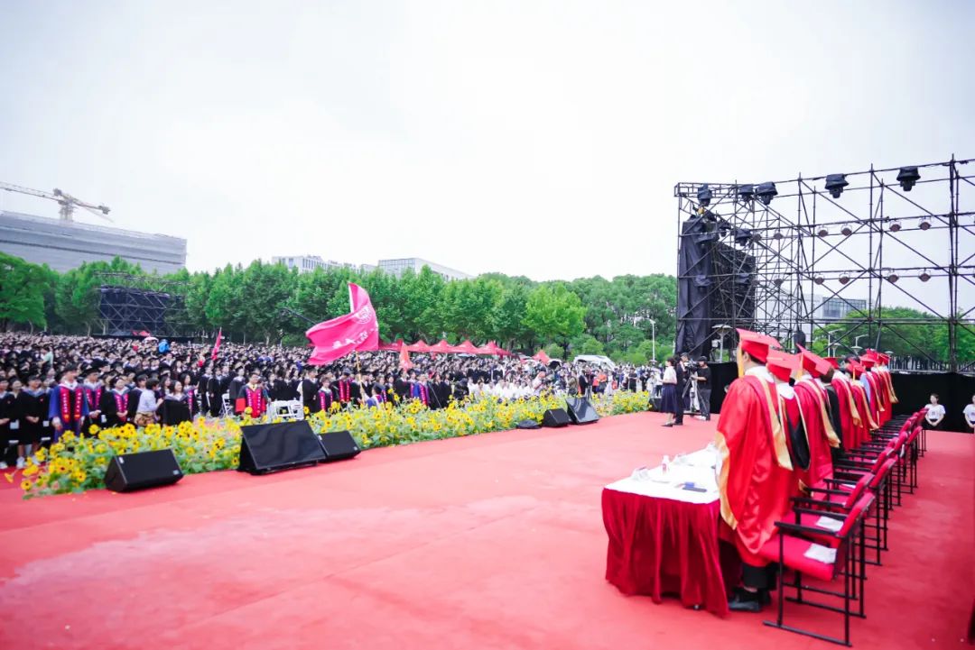 华东师大8000多名毕业生欢聚一堂。校领导梅兵、钱旭红、杨昌利、曹友谊、孟钟捷、周傲英、戴立益、雷启立、顾红亮、施国跃,校长助理,校学术委员会和各专门委员会负责人,学部、院系、书院负责人,机关职能部门和直属单位负责人,校友代表,教师代表,员工代表,毕业生亲友,教育部直属高校学习贯彻习近平新时代中国特色社会主义思想主题教育第六巡回指导组成员等出席典礼,一起见证华东师大学子完成学业开启人生新征程的重要时刻,为毕业生扬帆启航。