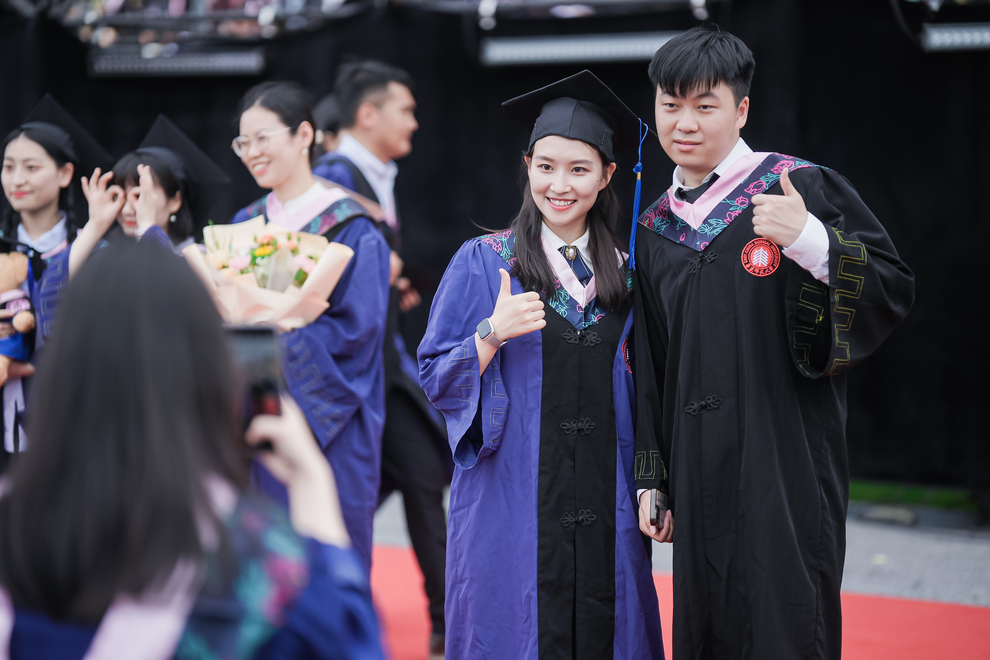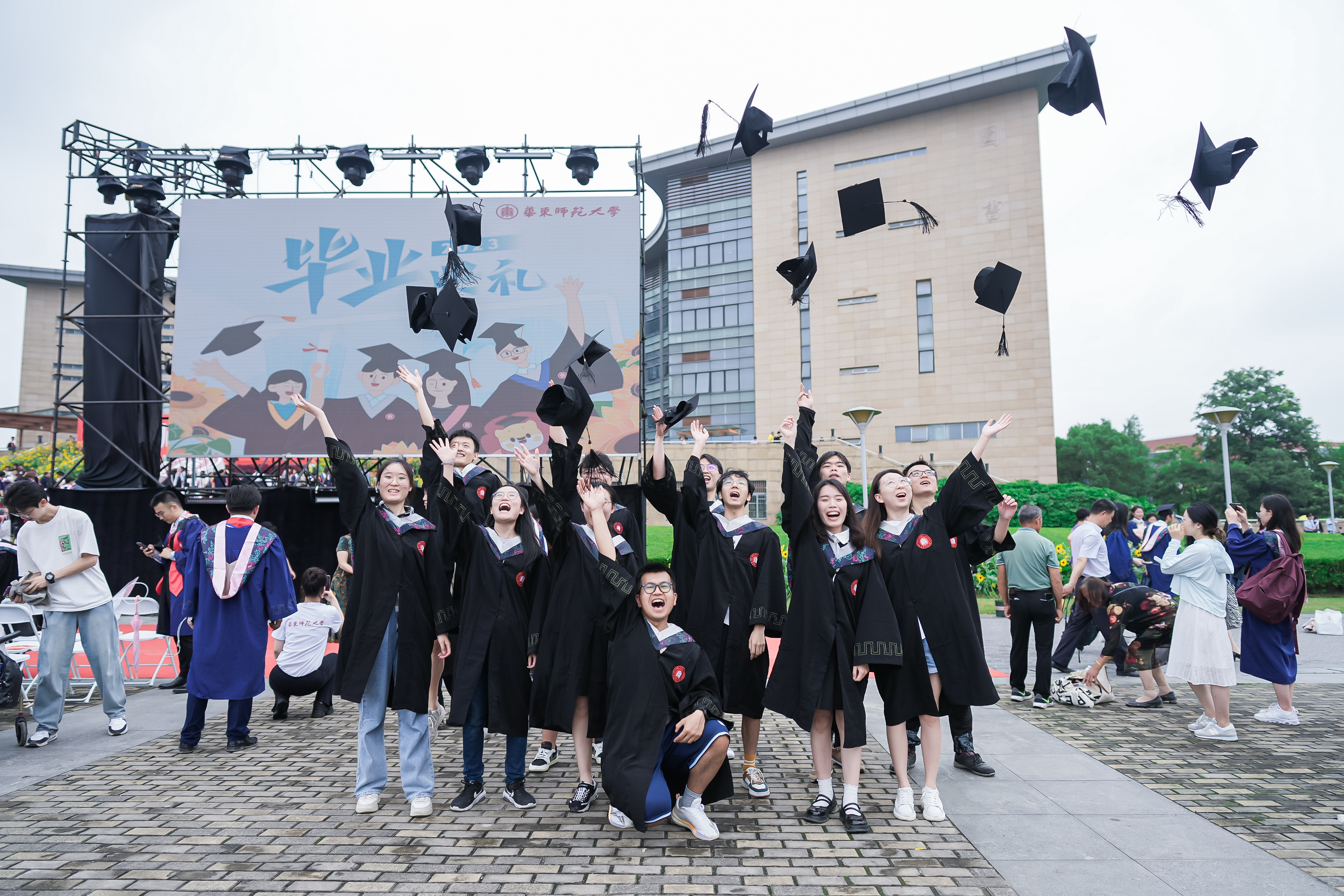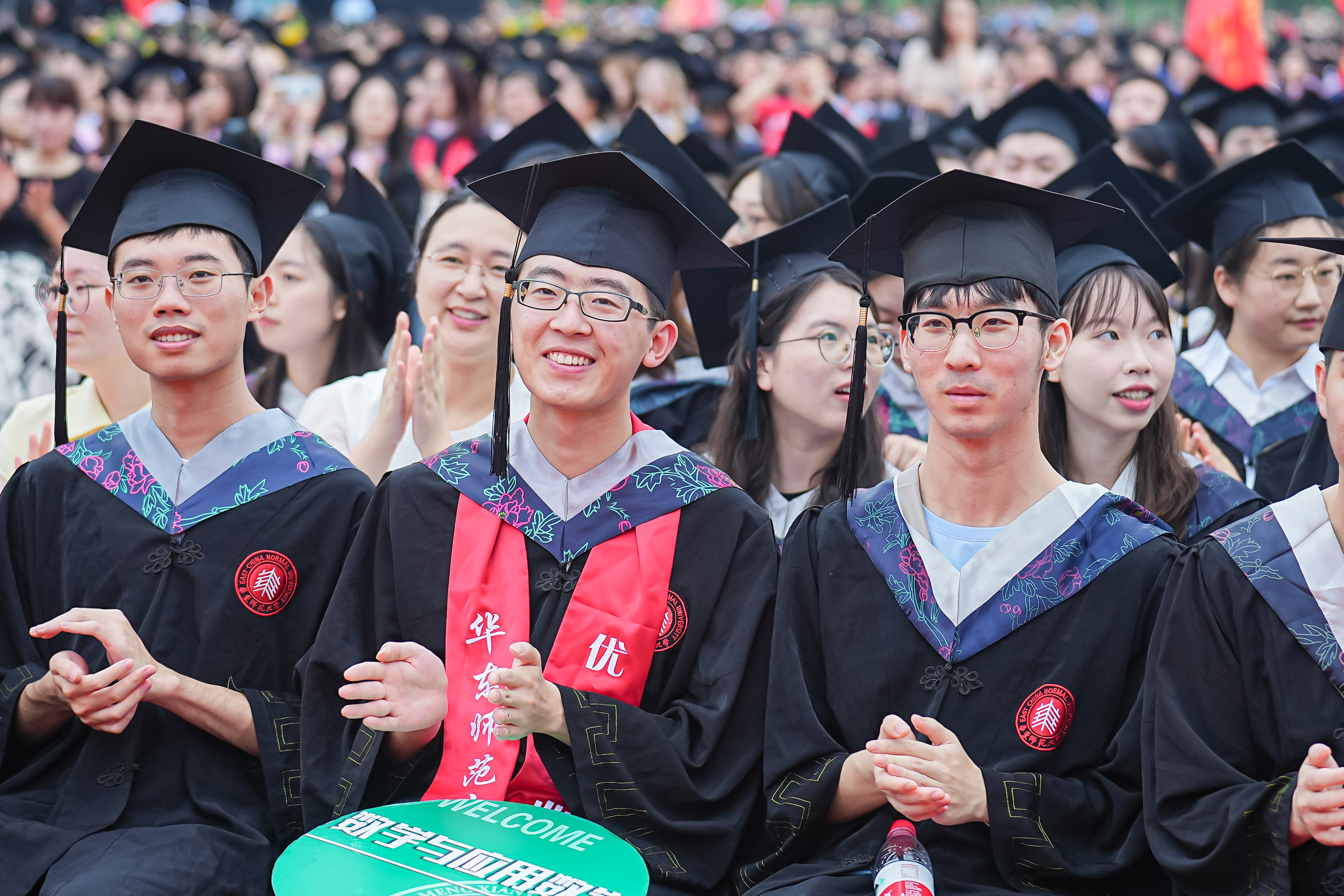 华东师大8000多名毕业生欢聚一堂。校领导梅兵、钱旭红、杨昌利、曹友谊、孟钟捷、周傲英、戴立益、雷启立、顾红亮、施国跃,校长助理,校学术委员会和各专门委员会负责人,学部、院系、书院负责人,机关职能部门和直属单位负责人,校友代表,教师代表,员工代表,毕业生亲友,教育部直属高校学习贯彻习近平新时代中国特色社会主义思想主题教育第六巡回指导组成员等出席典礼,一起见证华东师大学子完成学业开启人生新征程的重要时刻,为毕业生扬帆启航。
