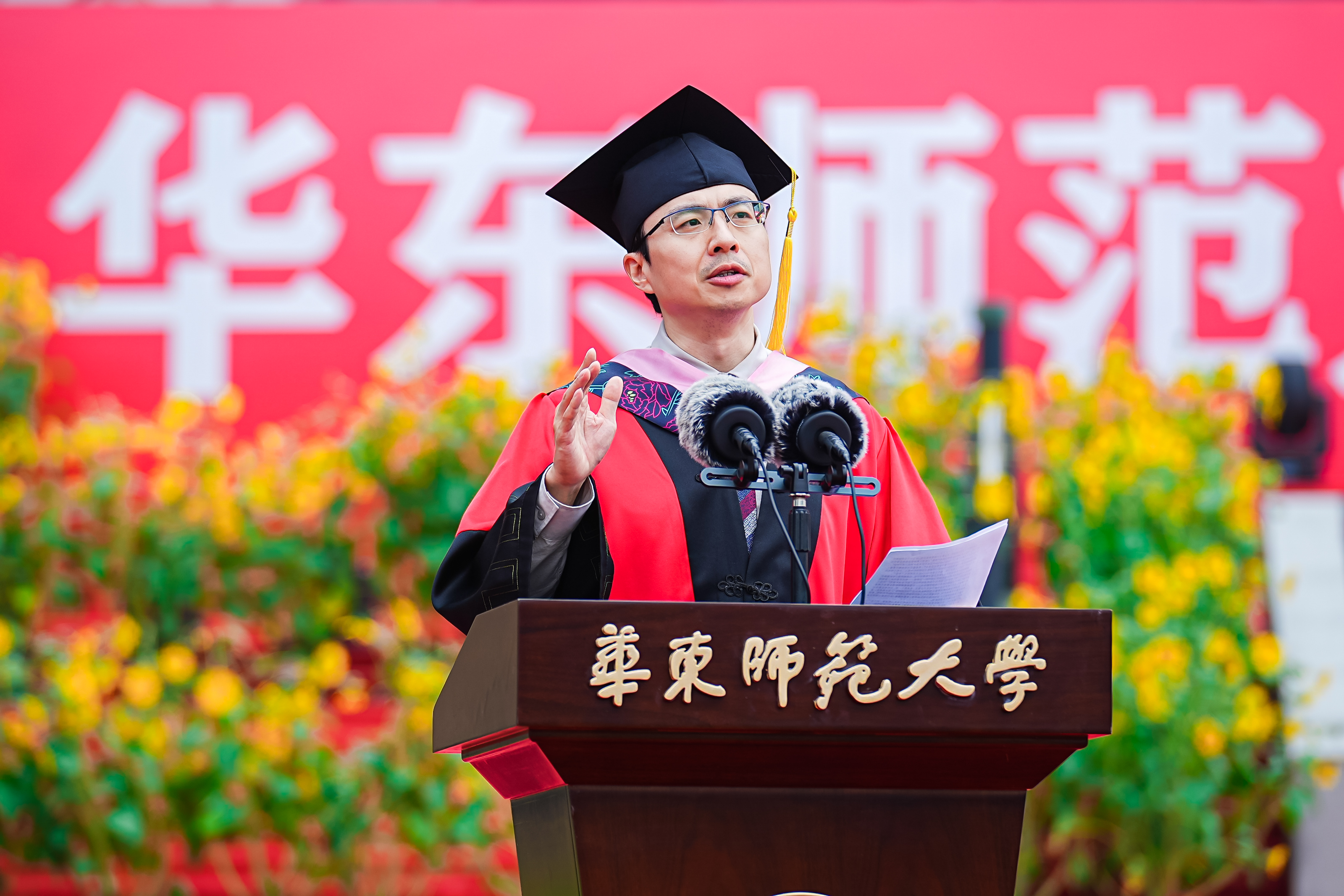 作为教师代表,政治与国际关系学院院长吴冠军教授在致辞中对华东师大毕业生寄予厚望,希望他们“展翅腾飞,在未来岁月中实现潜能、绽放生命”。他指出,走出学校的校门,绝不是挥别学习的生涯。面对GPT时代的挑战,他建议同学们要做量子思维的使用者。他说,“在人工智能时代依然追求卓越的人、不放弃学习甚至终身学习的人,就是华东师大要培养的人。”