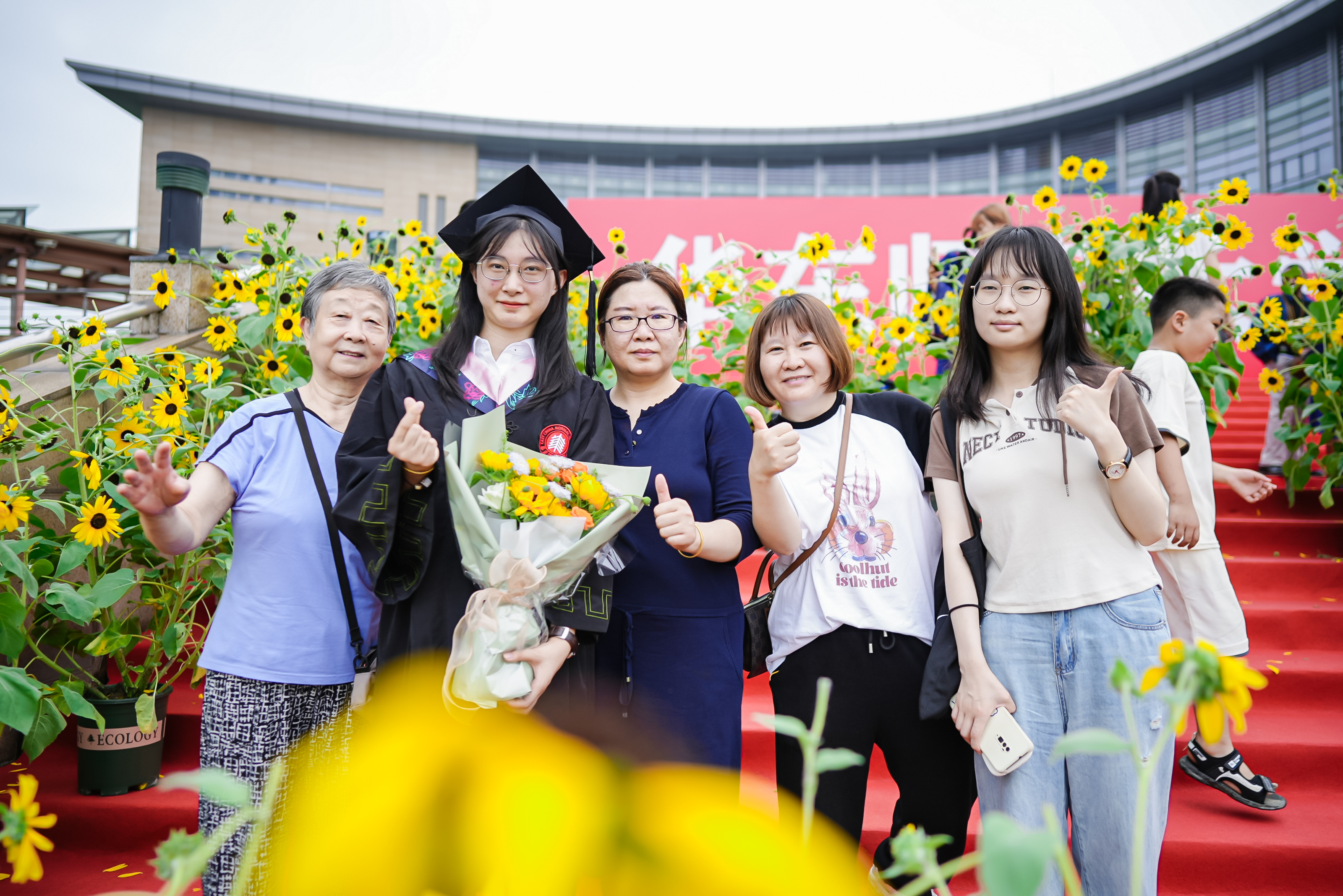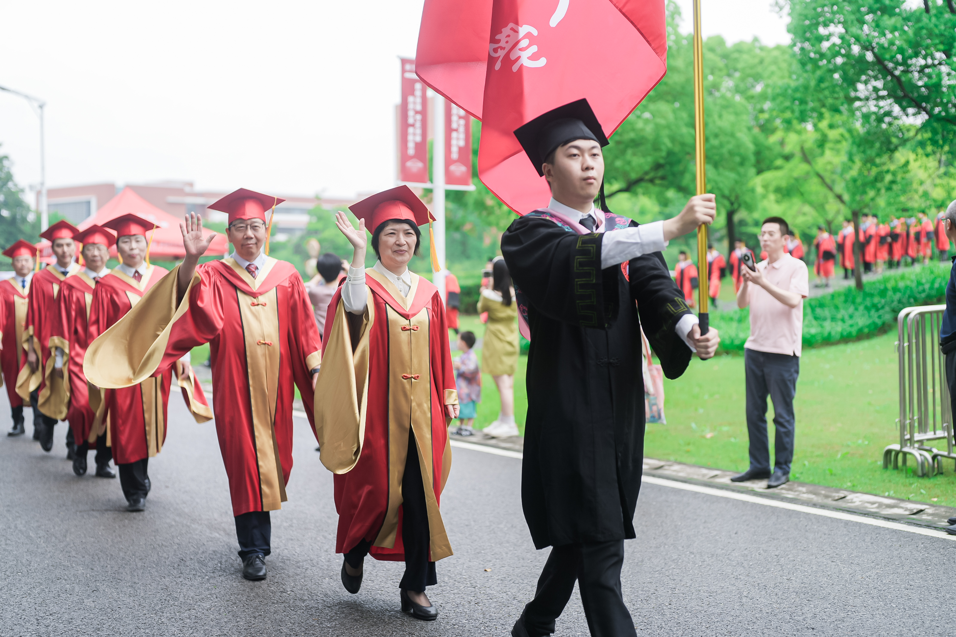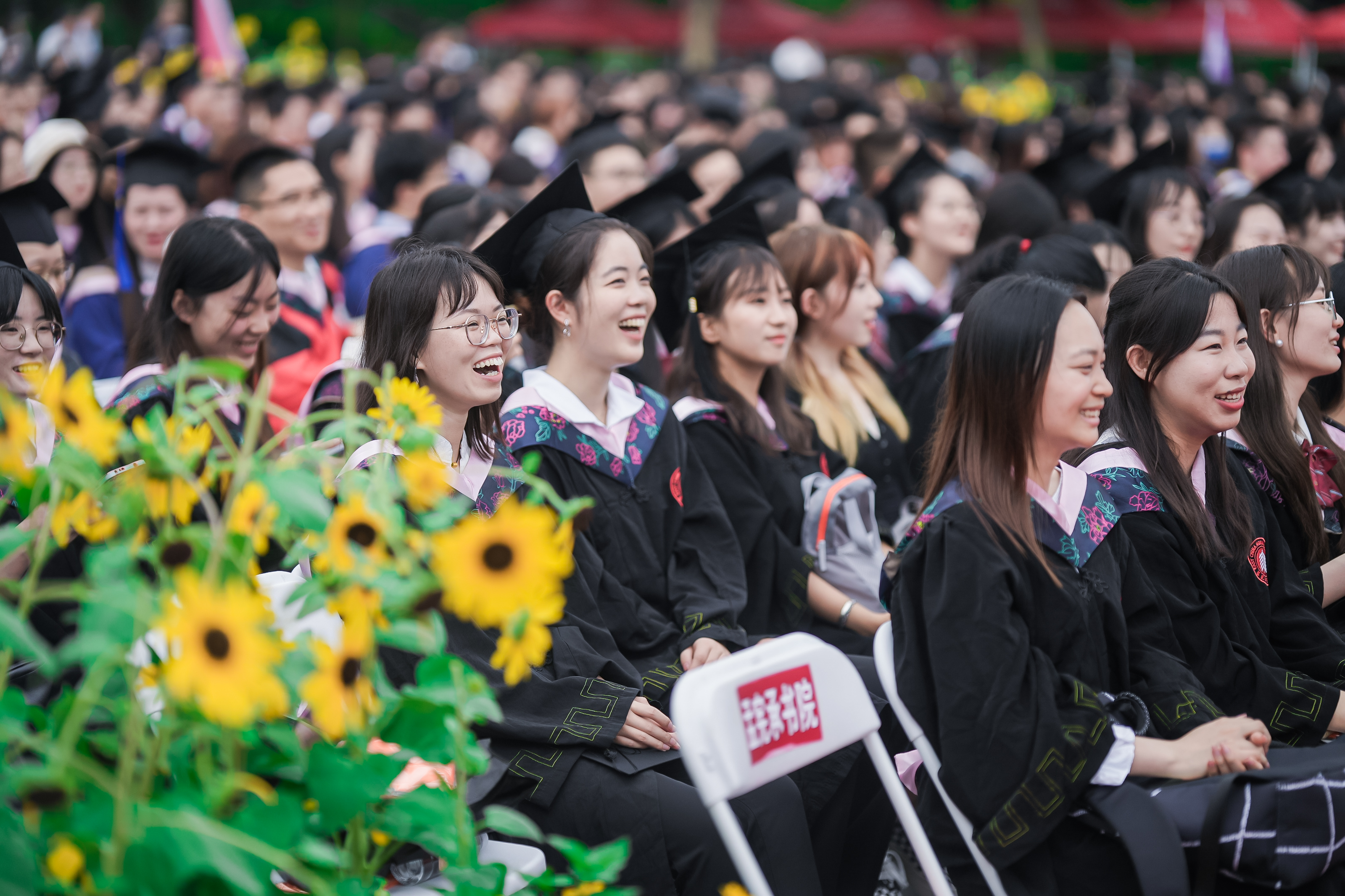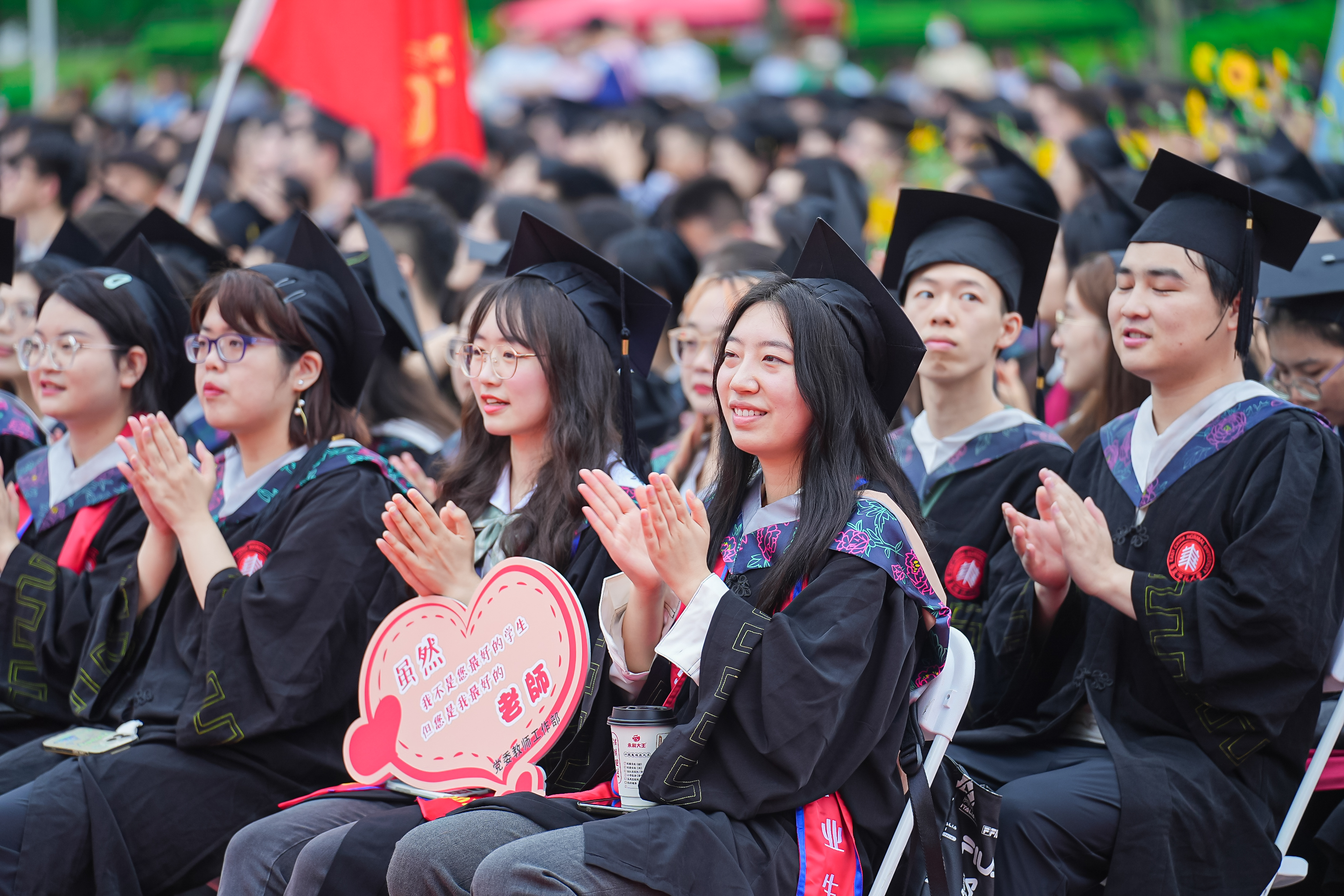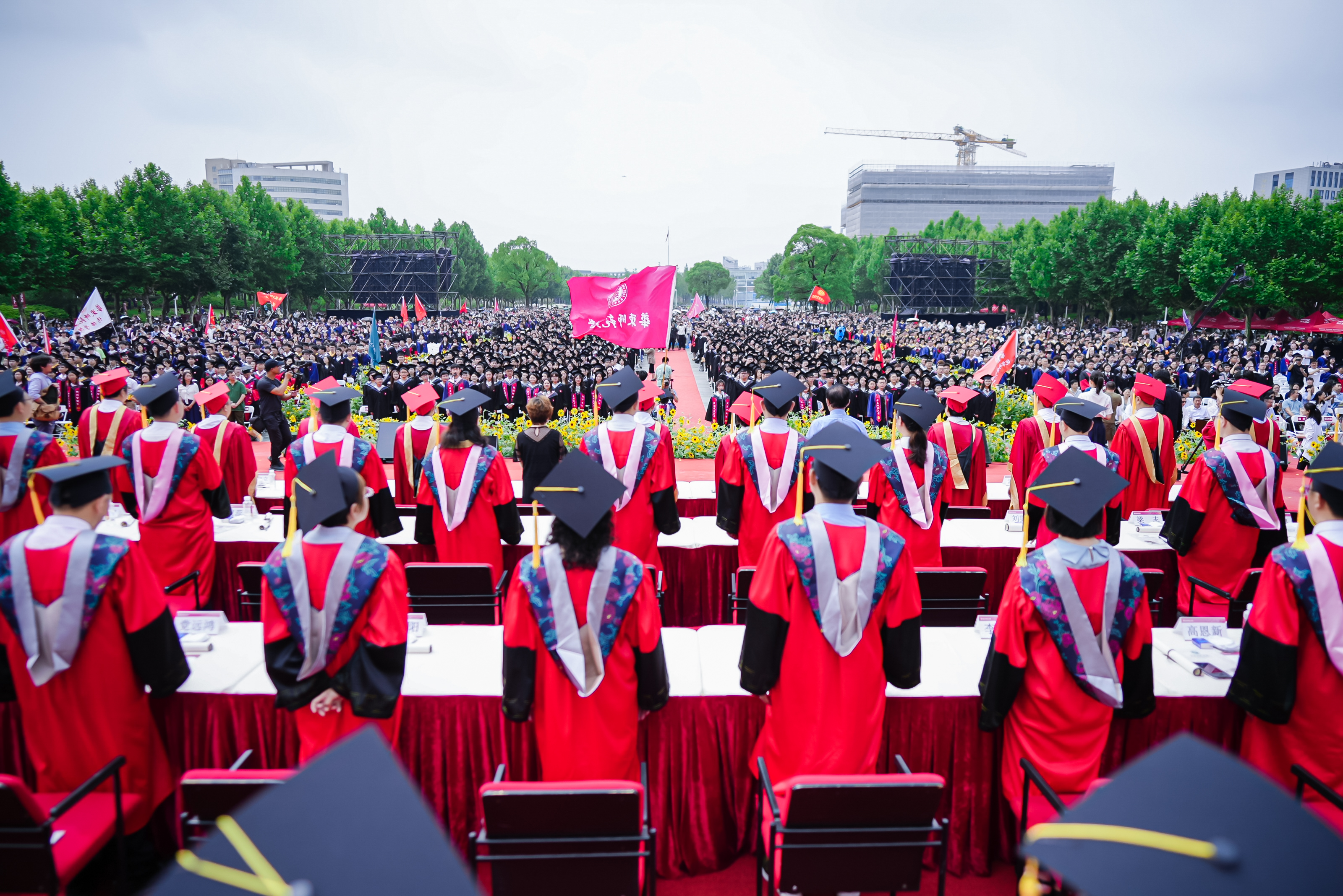 而华东师大的大爱也体现在学校日常生活世界的每一个细节之中。今天从凌晨3点到早上8点,学校后勤布置300盆毕业花向日葵,摆放8000件雨衣和8000瓶饮用水,准备37辆往返班车,开设14个餐厅的“毕业餐专窗”……因为梅雨季连日暴雨来袭,给毕业典礼的会场安排带来了不小的困难。华东师大后勤人坚守现场,默默付出,也以普通劳动者的岗位意识和奉献精神给同学们上了“毕业一课”。