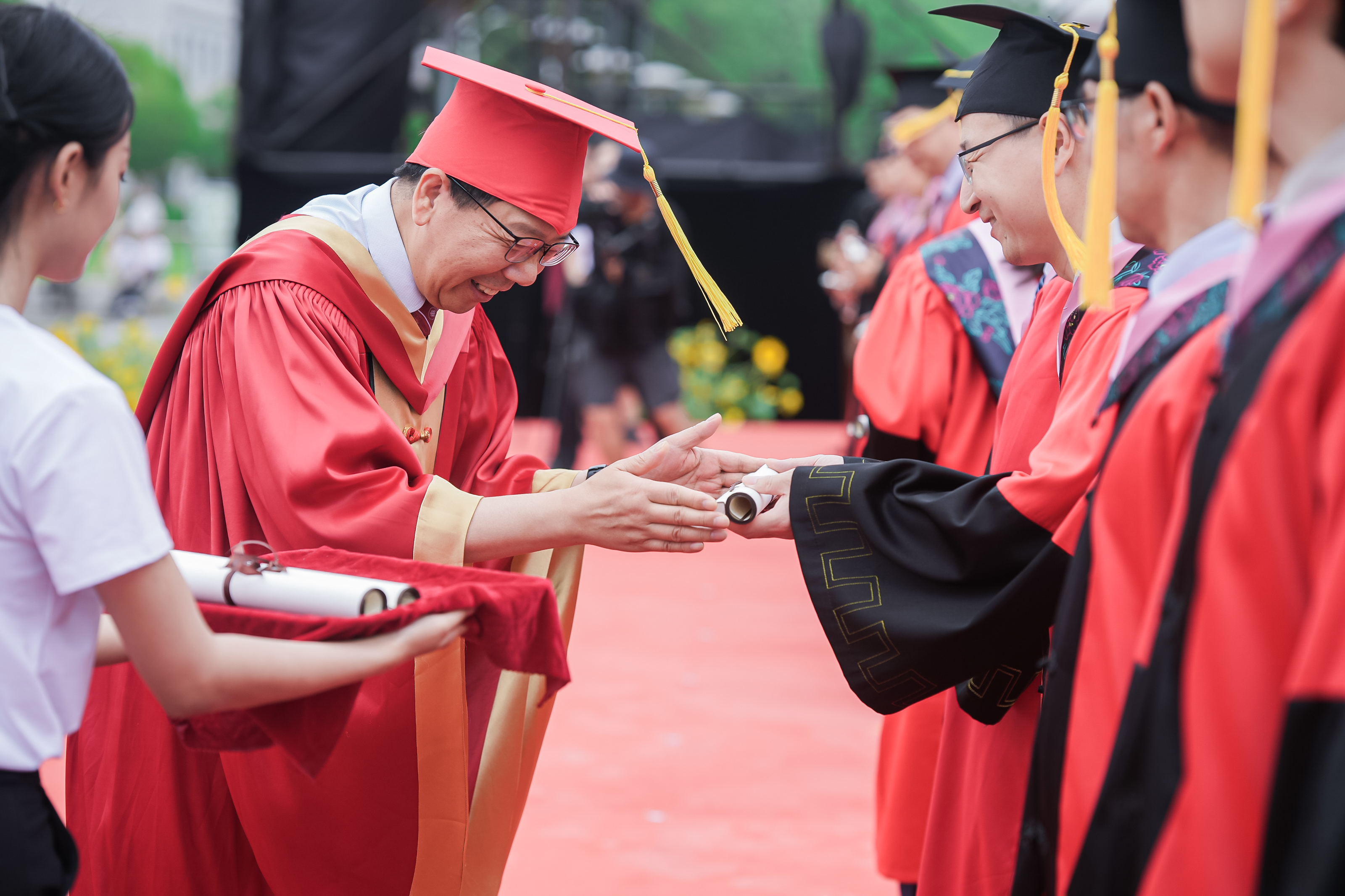 校长、校学位评定委员会主席钱旭红向学部、院系负责人颁发学历学位授权书,希望通过他们将这份荣耀和祝福传递给每一位毕业生。