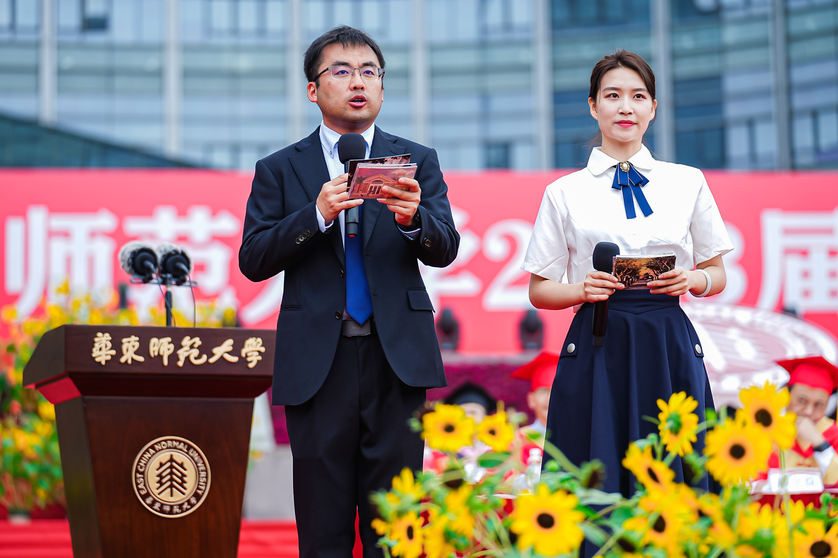 毕业典礼由全国创新争先奖、上海市青年科技杰出贡献奖获得者,化学与分子工程学院教授姜雪峰和传播学院2023届研究生杨晨主持