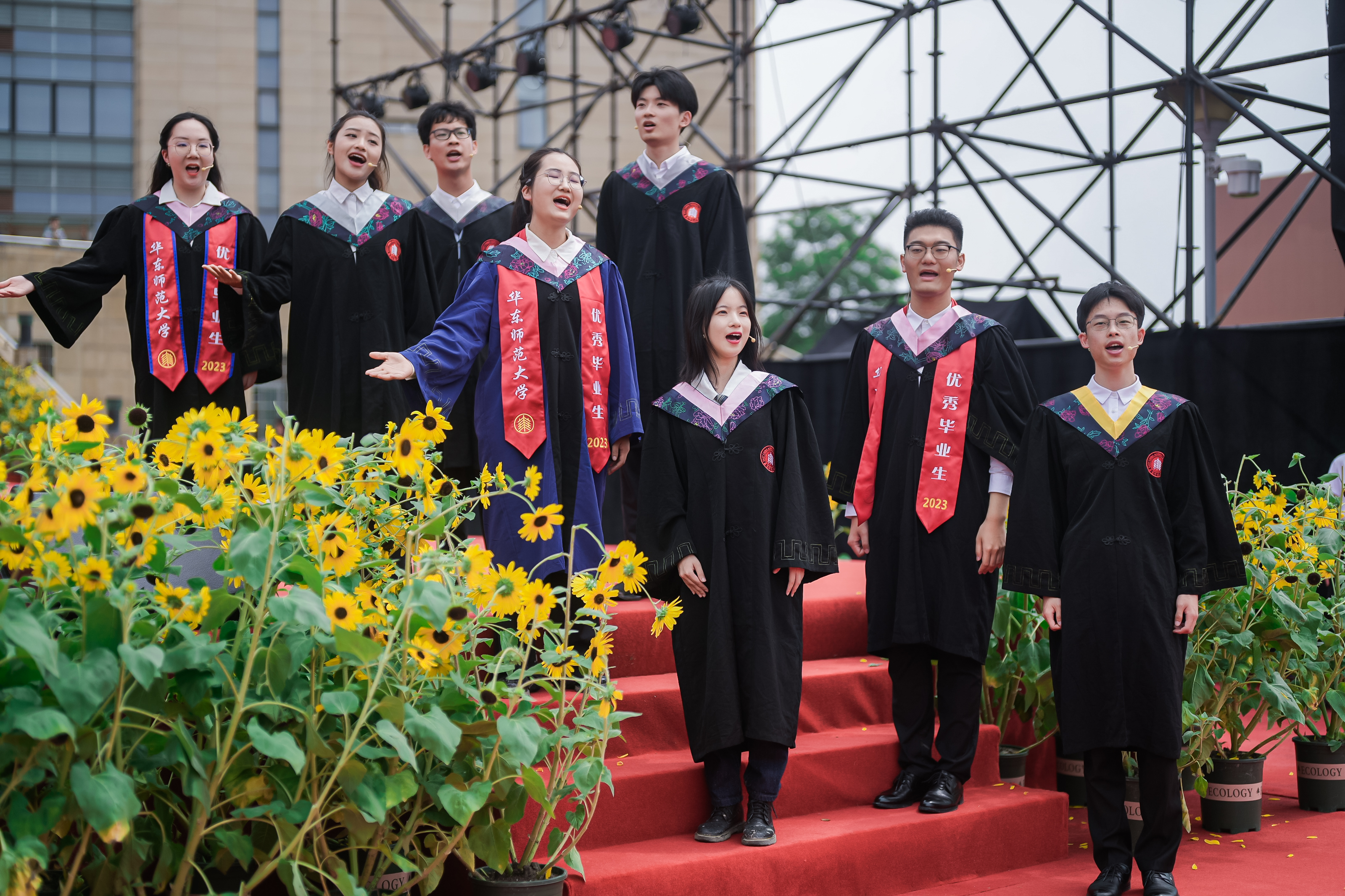 当合唱团演唱的《强国一代有我在》的歌声响起,将毕业典礼推向了高潮。“追求卓越,逐梦远航!” 在飘扬的校旗下,在全体毕业生一声声激情澎湃的宣誓声中,华东师大毕业生扬帆起航,逐梦而行,将用智慧和汗水书写更加精彩的报国篇章。