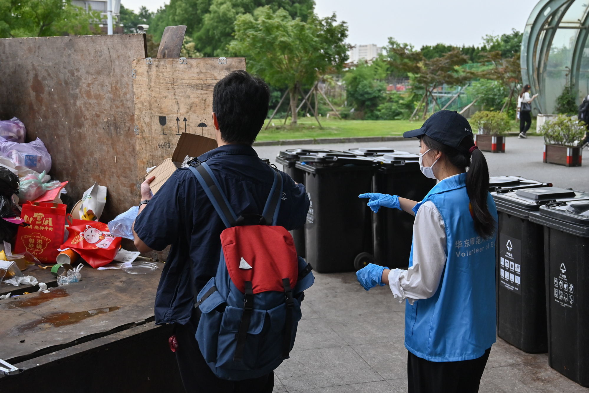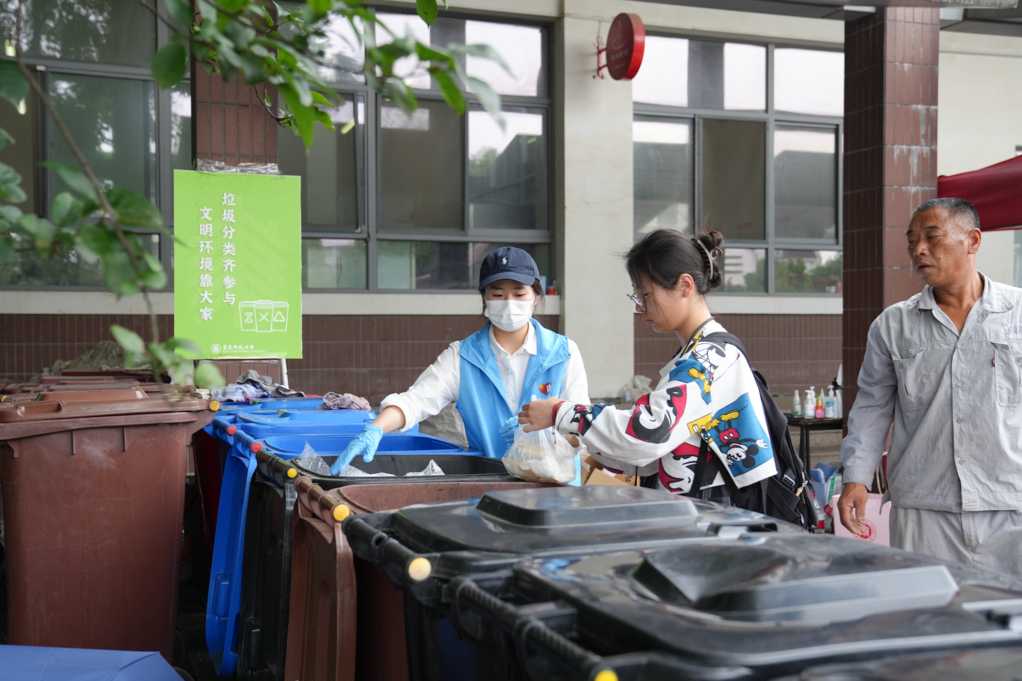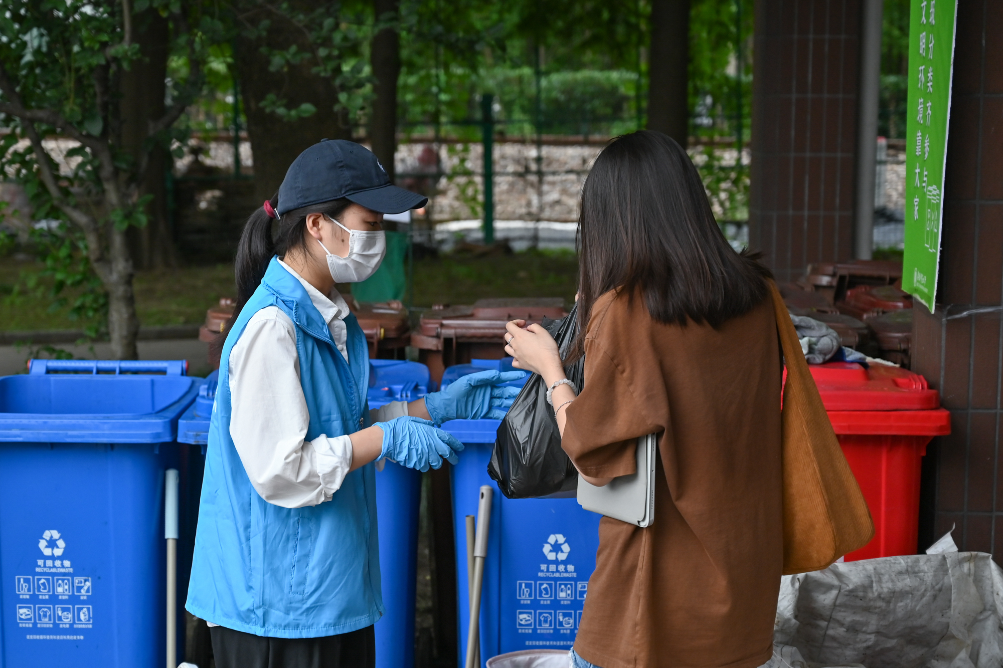 “这个属于可回收垃圾,请折叠放在这里,谢谢!”在垃圾回收站,外语学院将继续在母校攻读博士学位的吴郁蓉同学熟练地引导前来扔垃圾的同学们进行垃圾分类。烈日下,她戴着口罩、胶皮手套,耐心地一遍遍引导的同时,还要时不时地在垃圾箱中挑出同学不慎放错的饮料瓶、废纸盒等。