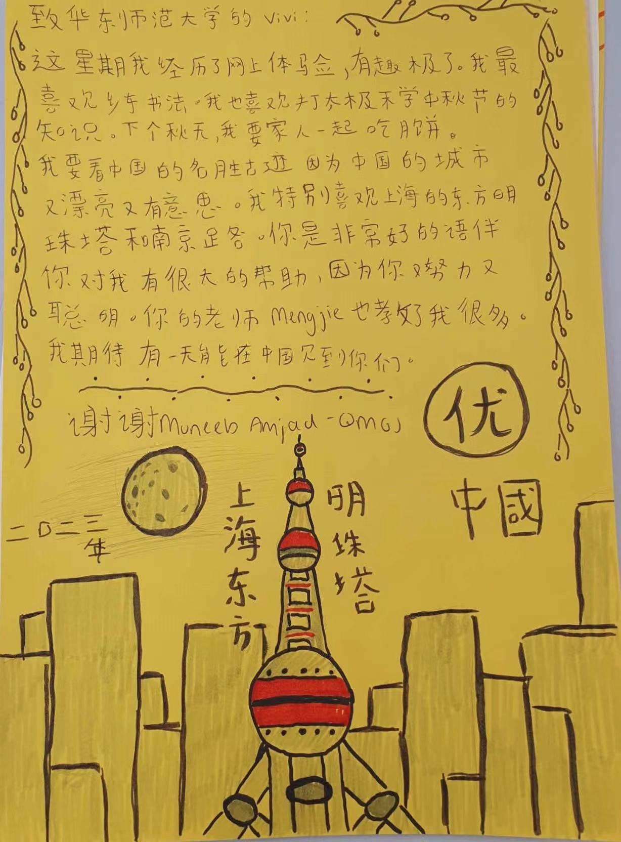 来自Queen Mary’s Grammar School的Amjad在致华东师大的一封信中写道:“我最喜欢练书法,我也喜欢打太极拳和学习中秋节的知识。下个秋天,我要和家人一起吃月饼。我特别喜欢上海的东方明珠塔和南京路,期待有一天能在中国见到你们。”
