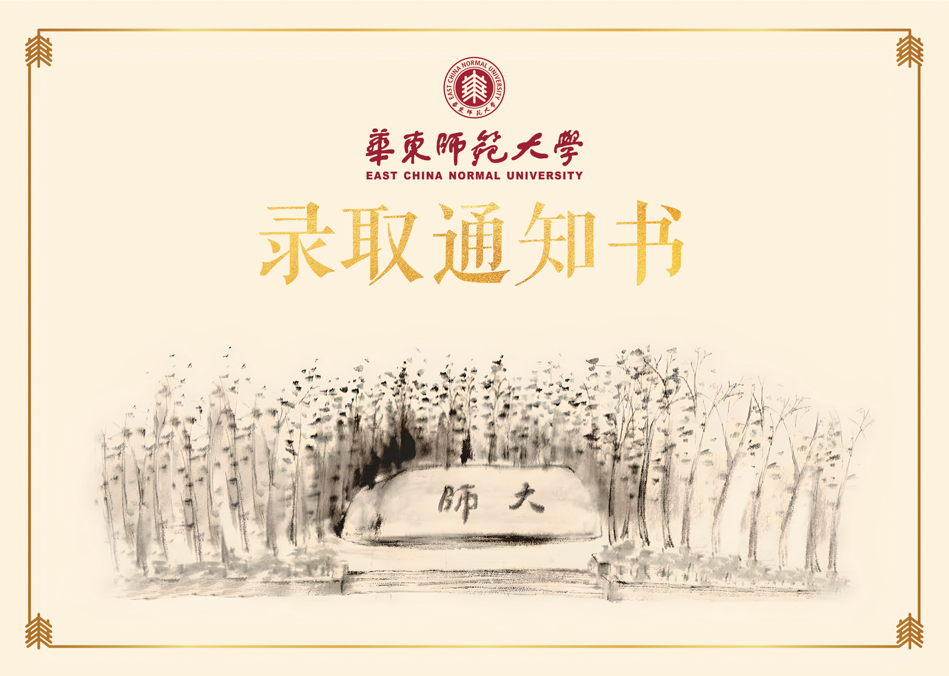 录取通知书整体由华东师大美术学院的青年教师章文副教授设计,将传统的竖排版转变为横排版设计,让文字页面焕发出新的生命力。通知书的主视觉图沿用了美术学院郑文教授的“大师石”水墨画,既是传承,也是发展。