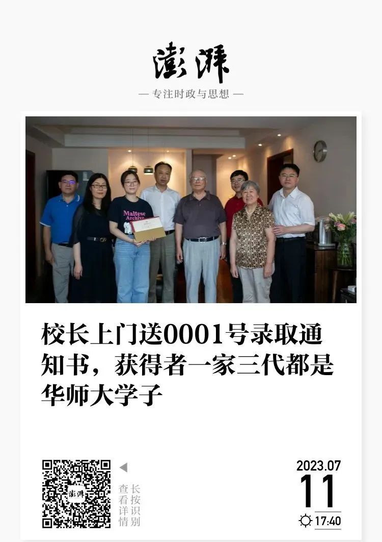 今年,华东师大0001号本科录取通知书获得者是上海宜川中学万沣玮同学。在万沣玮同学家,包括外公、外婆、奶奶、妈妈、舅舅,祖孙三代共有六位华东师大人。7月11日,副校长戴立益将录取通知书送到有着华东师大“基因”的幸福之家。