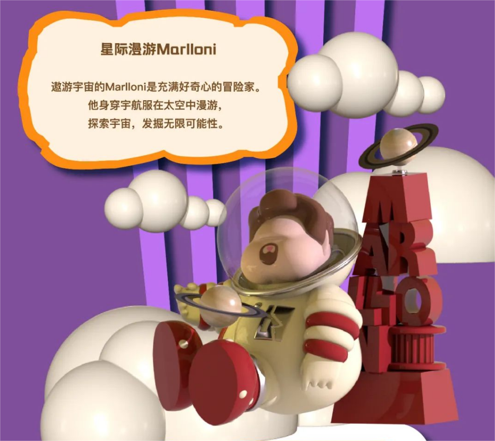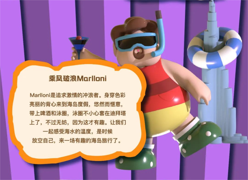 在平行宇宙中,胖乎乎的Marlloni,充满热情与活力,拥有多重身份,迪拜哈利法塔和由Marlloni名字组成的超高层建筑随着Marlloni的形态发生变化。