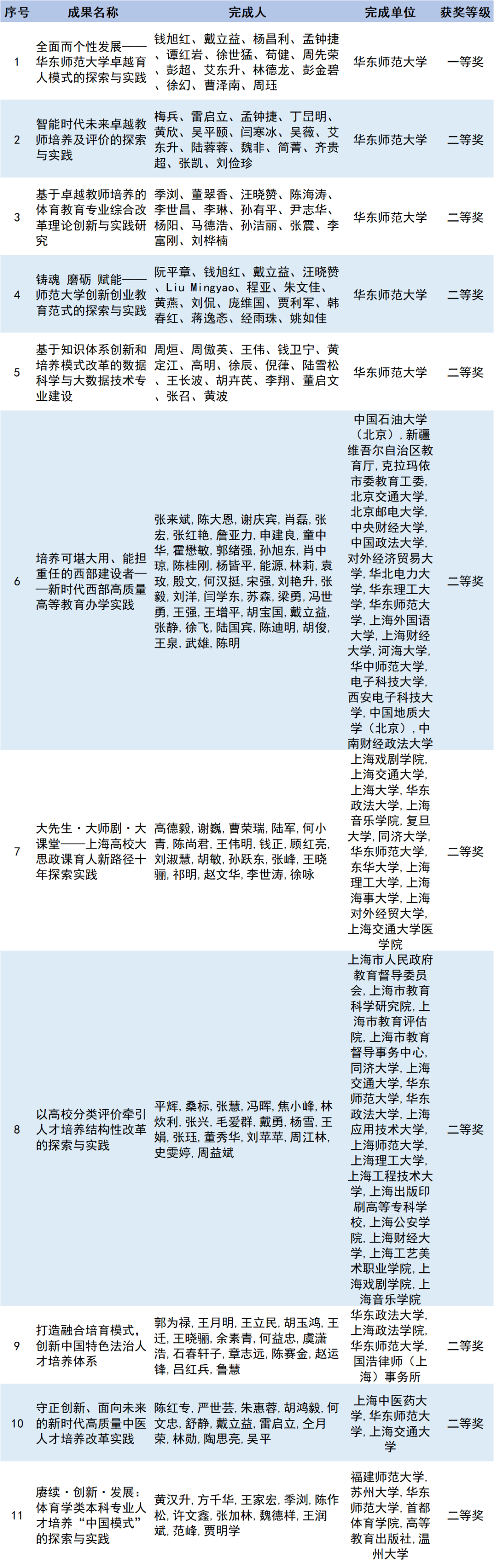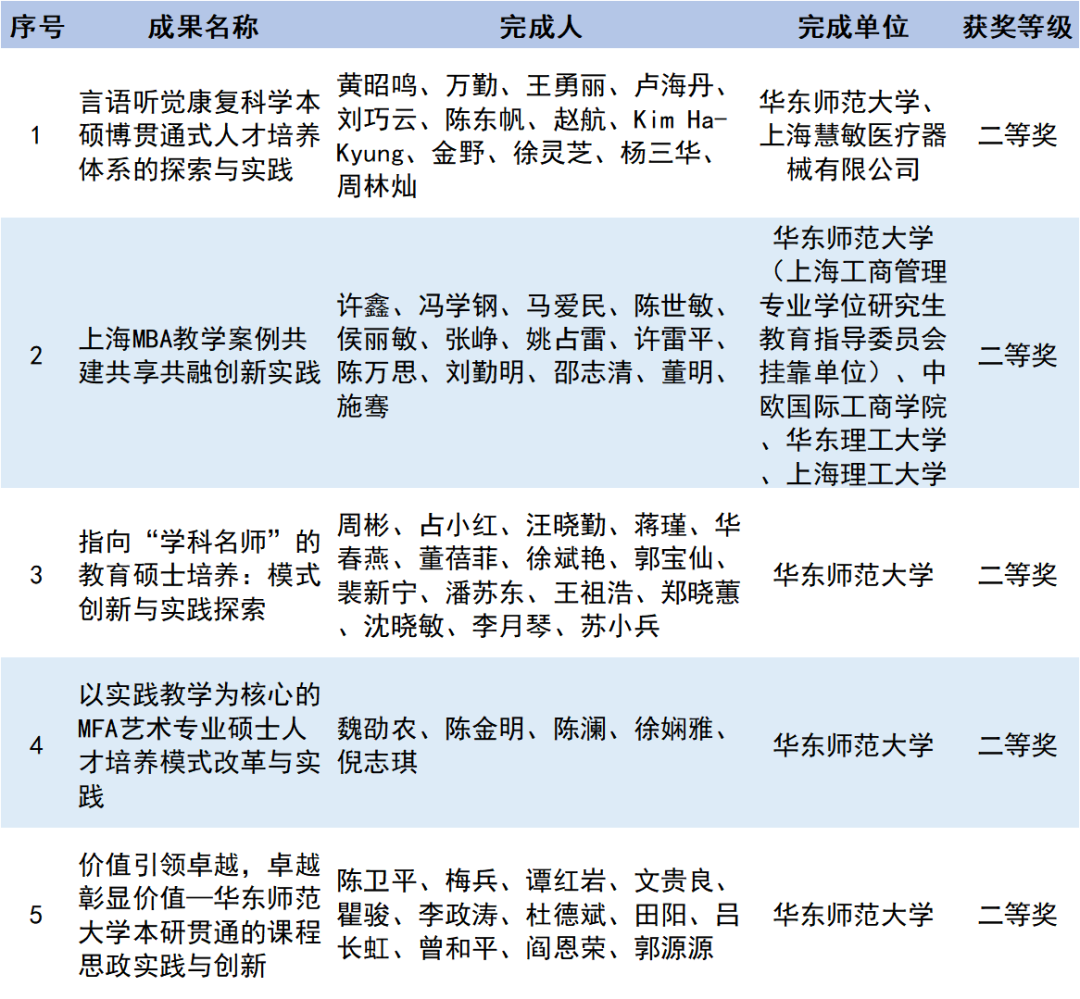 华东师大2022年高等教育(研究生)国家级教学成果奖获奖名单