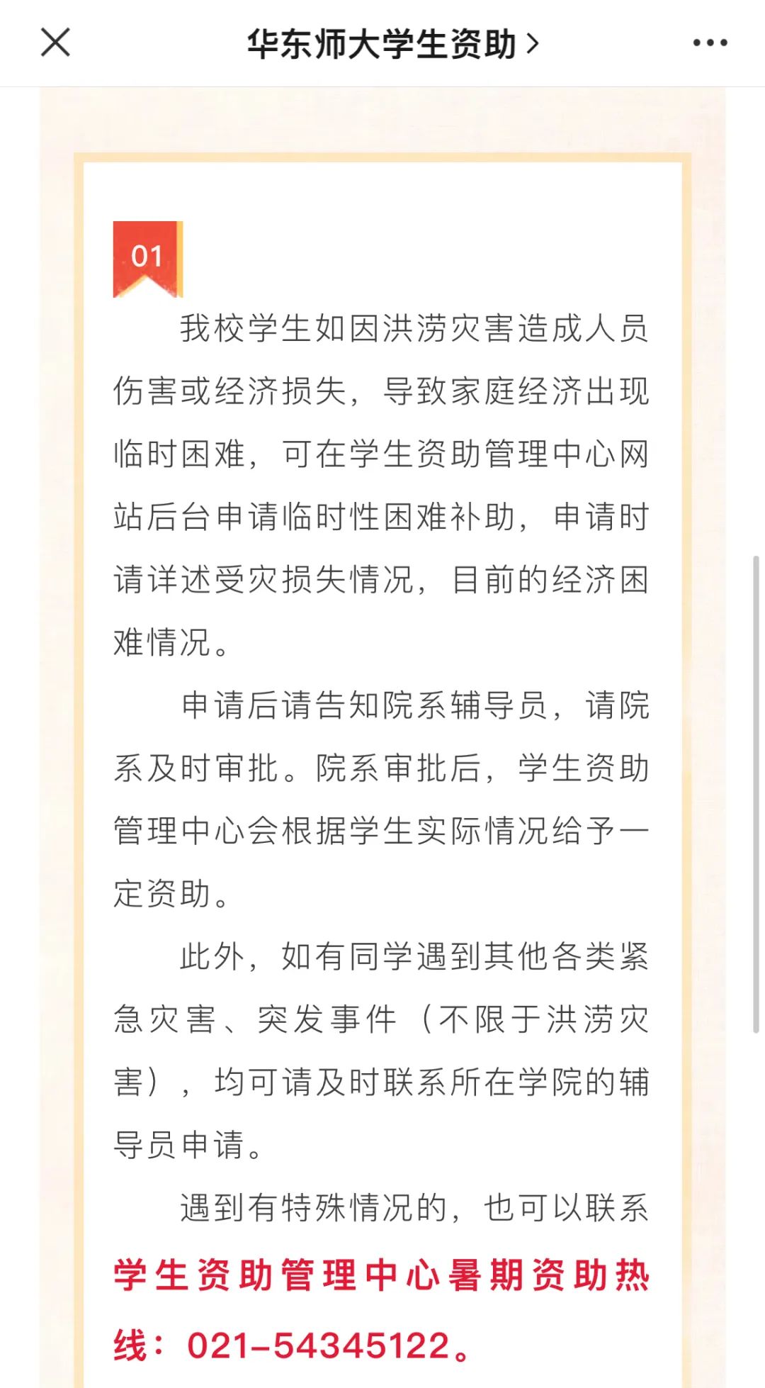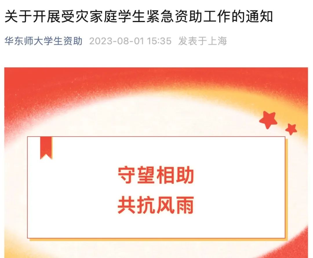 为保障受灾家庭学生学习和生活,帮助受灾学生家庭缓解经济压力,澳门永利皇宫官网入口于8月1日即下发通知告知学生,如因洪涝灾害造成人员伤害或经济损失,导致家庭经济出现临时困难的,均可在学校学生资助管理中心网站后台申请临时性困难补助。