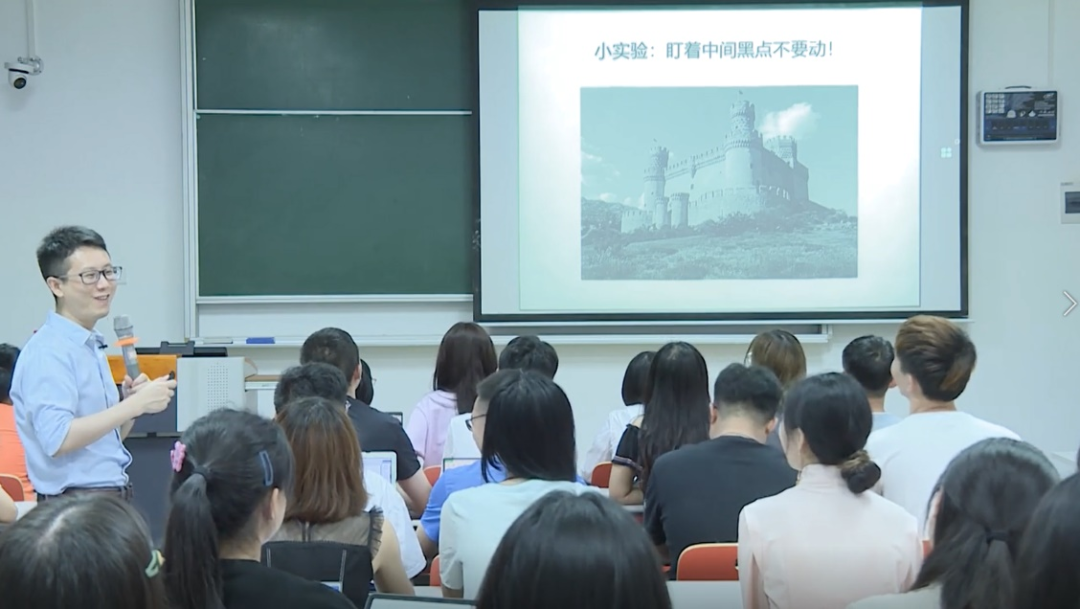 “哇!”倒计时结束,同学们异口同声地发出惊叹。心理与认知科学学院副教授汪晨波切换课件,映入同学们眼帘的黑白城堡画面短暂变成了蓝天白云绿草地的彩色画面,老师娓娓道来,为同学们“解密”,颜色视觉后象……