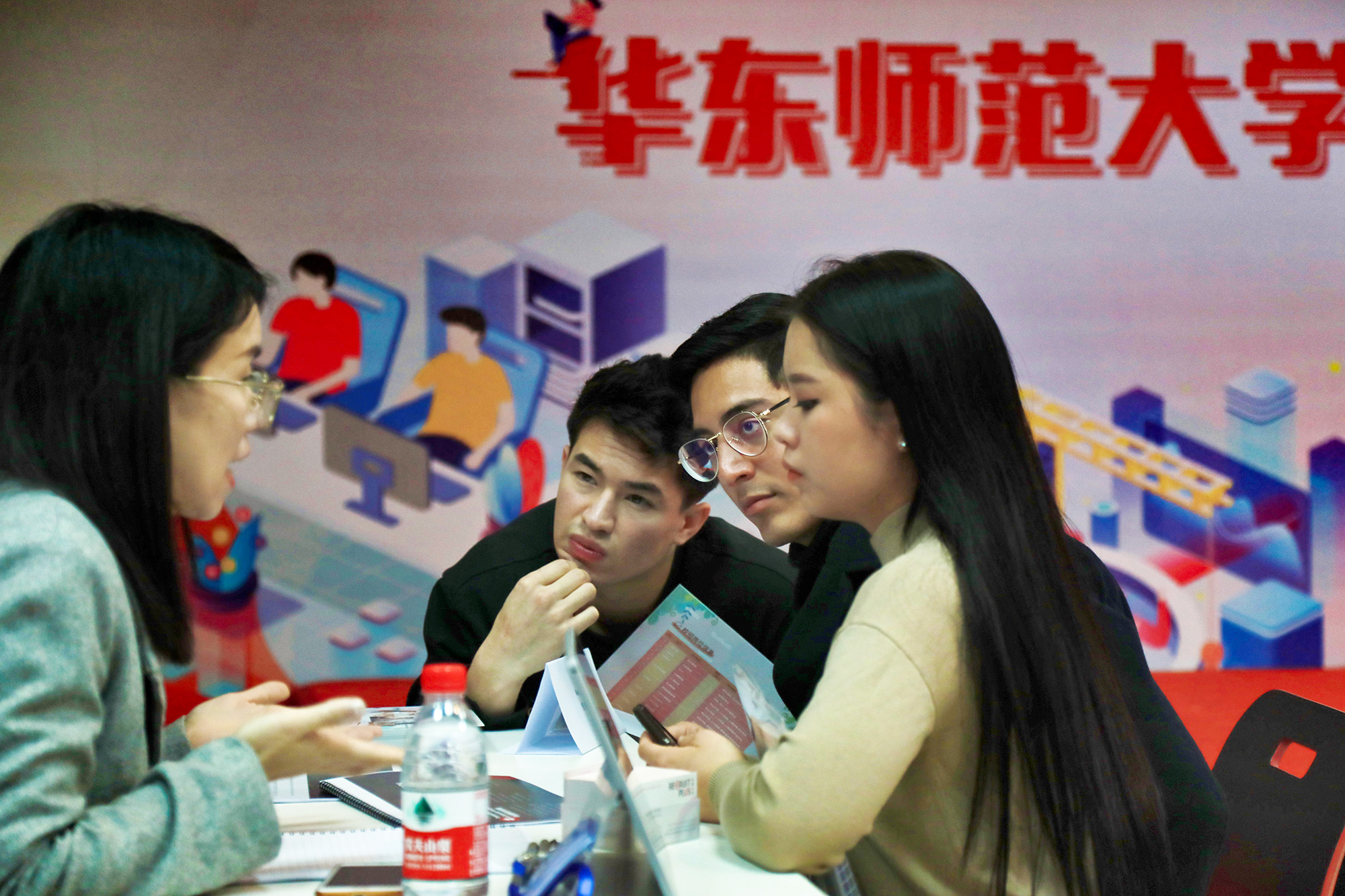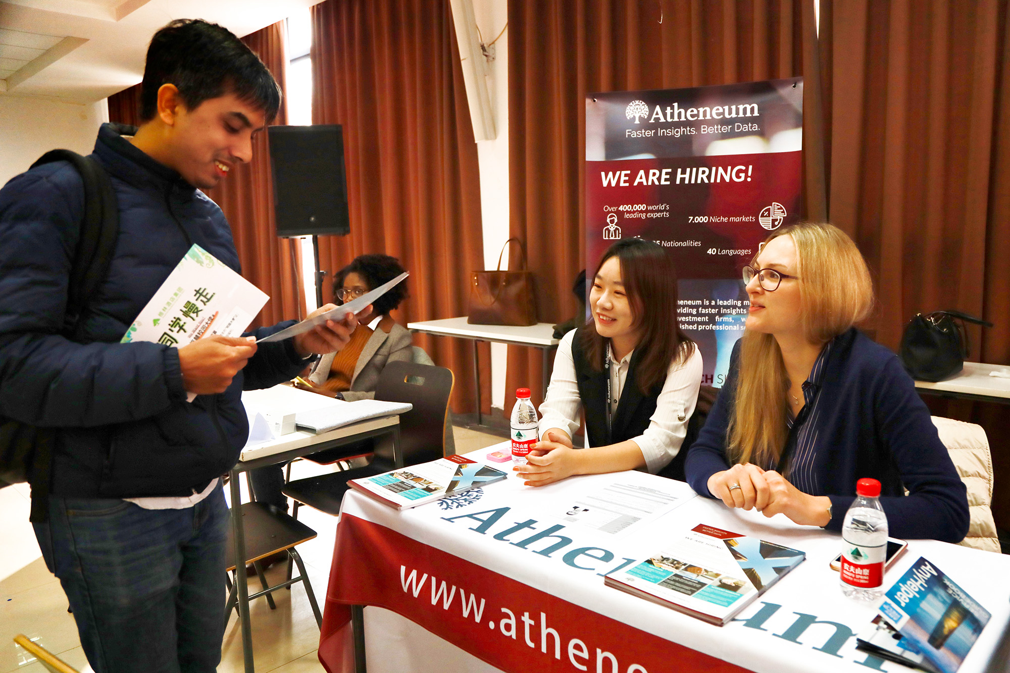 12月28日,我校首届国际学生校园招聘会暨国际学生就业咨询宣讲会在中山北路校区物理楼举行。华为、海尔、携程、友邦保险、格美集团等40余家国内外知名企业参展,共有来自韩国、日本、美国、俄罗斯、泰国、巴基斯坦、马来西亚等近30个国家的数百名国际学生参加了此次招聘会。