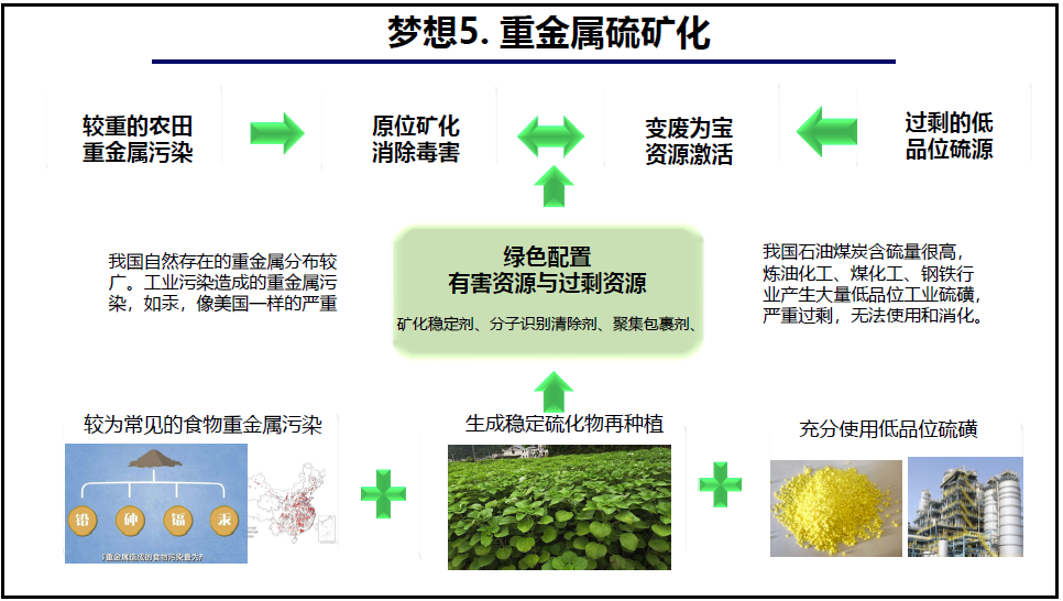 一些地区存在严重的农田重金属污染,而石油煤炭含硫量很高,炼油化工、煤化工、钢铁行业产生大量低品位工业硫磺,无法使用和消化,严重过剩。通过对无用资源的绿色配置,生成长期稳定的重金属硫磺物并矿化,农业的重金属污染和工业的低品位硫资源利用,极有可能得到很好的解决,从而消除毒害、变废为宝、激活资源。