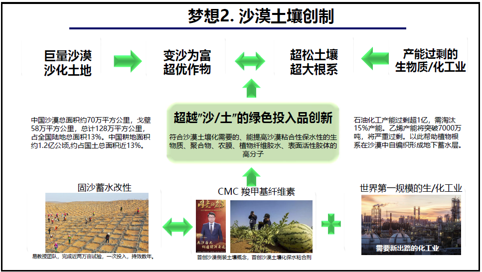 依此沙漠土壤化路线,我们的研究者们可以创制更多的沙漠粘合性保水剂、农膜、植物纤维胶水等绿色投入品,而我国石油化工等产能过剩,可以转型生产大量生物质基或者环境生态友好的绿色投入品,使其获得更大规模的发展。