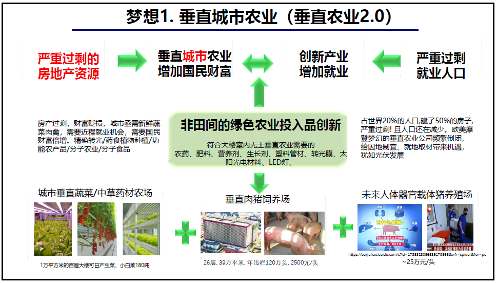 利用严重过剩的房地产资源,通过因地制宜、就地取材,建立起价廉物美的垂直农业2.0,即“垂直城市农业”,并以此创新产业、增加就业。其主业包括城市垂直蔬菜/中草药材农场、垂直肉猪饲养场、人类器官载体猪养殖场。