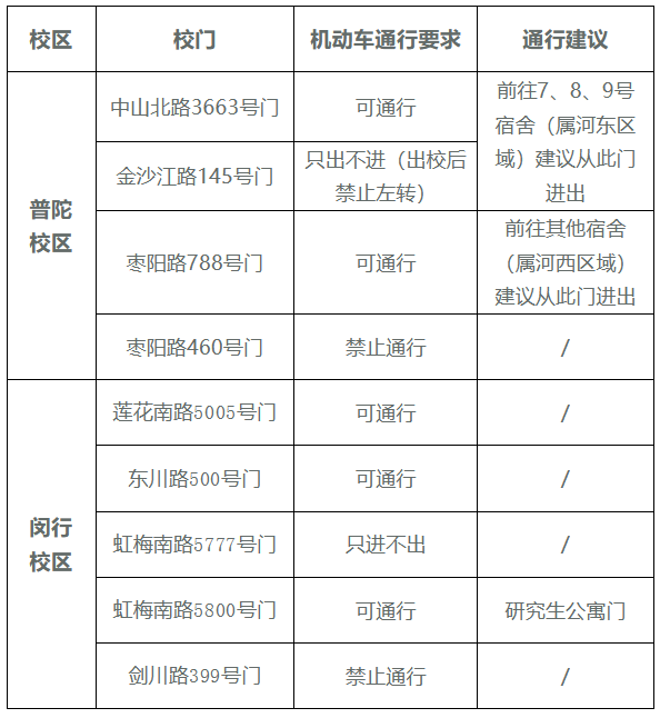 2、机动车辆可从中山北路3663号门、枣阳路788号门、金沙江路145号门(现教发工地门)通行;金沙江路门只出不进(出校后禁止左转)。枣阳路460号门禁止机动车辆通行。