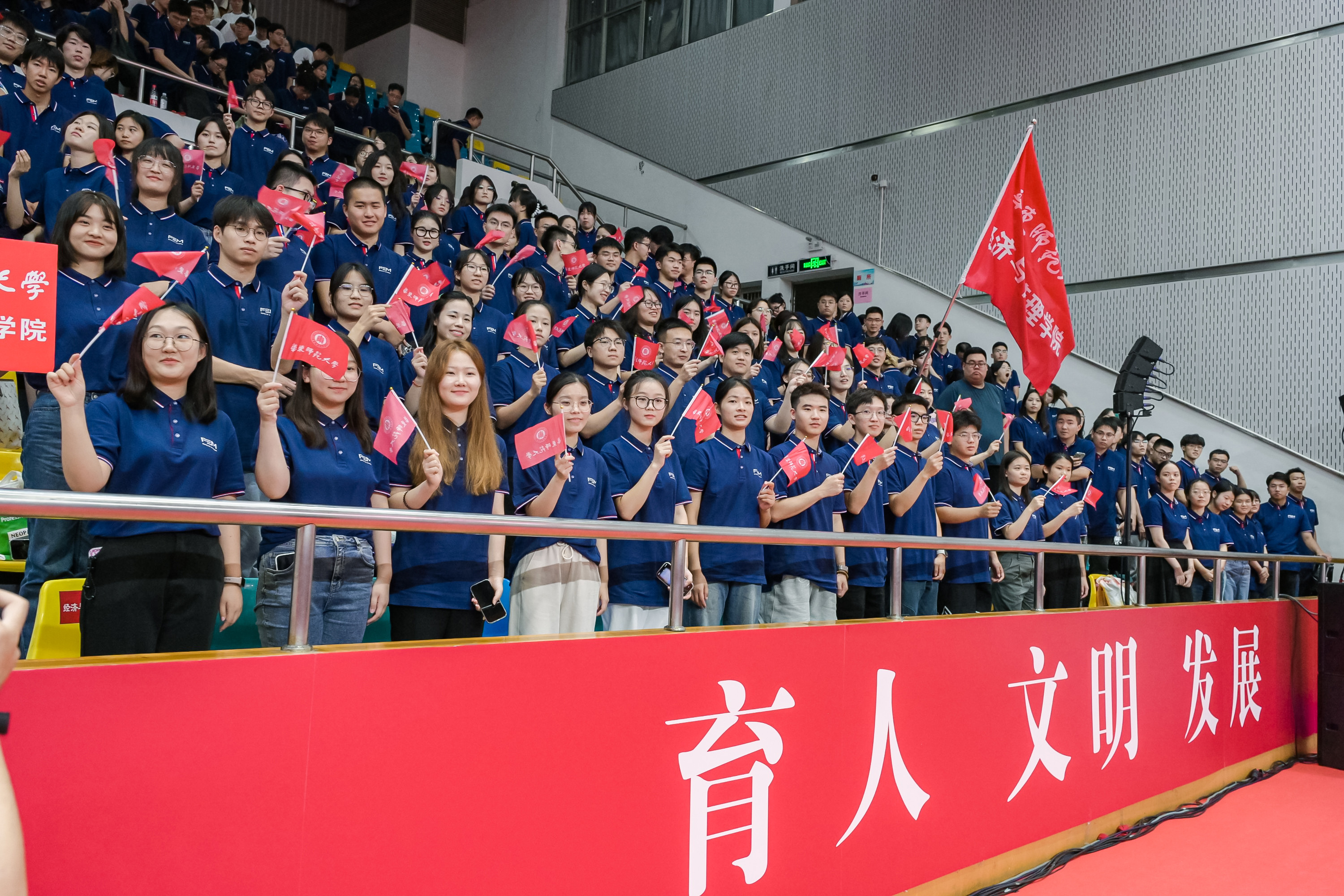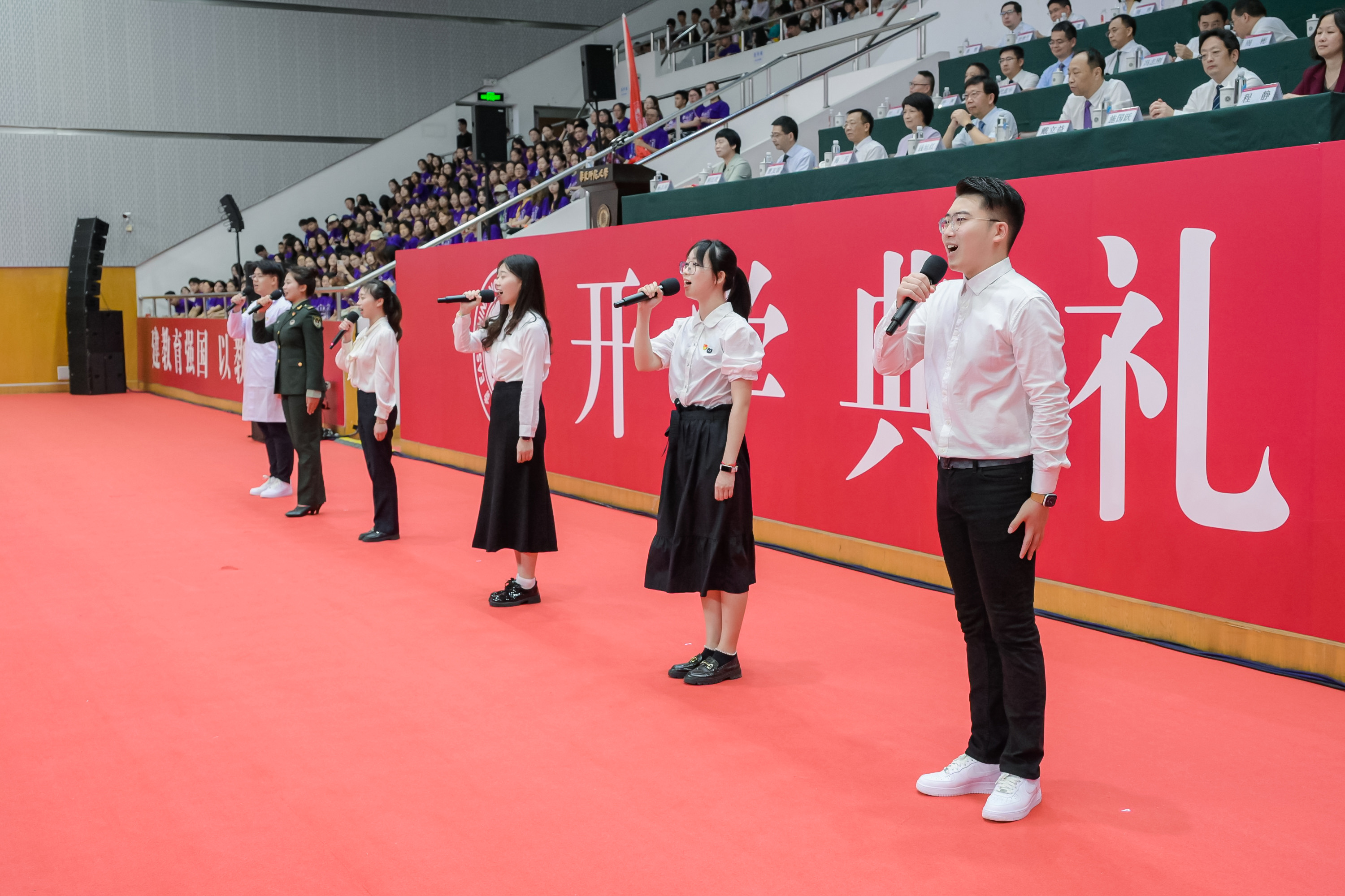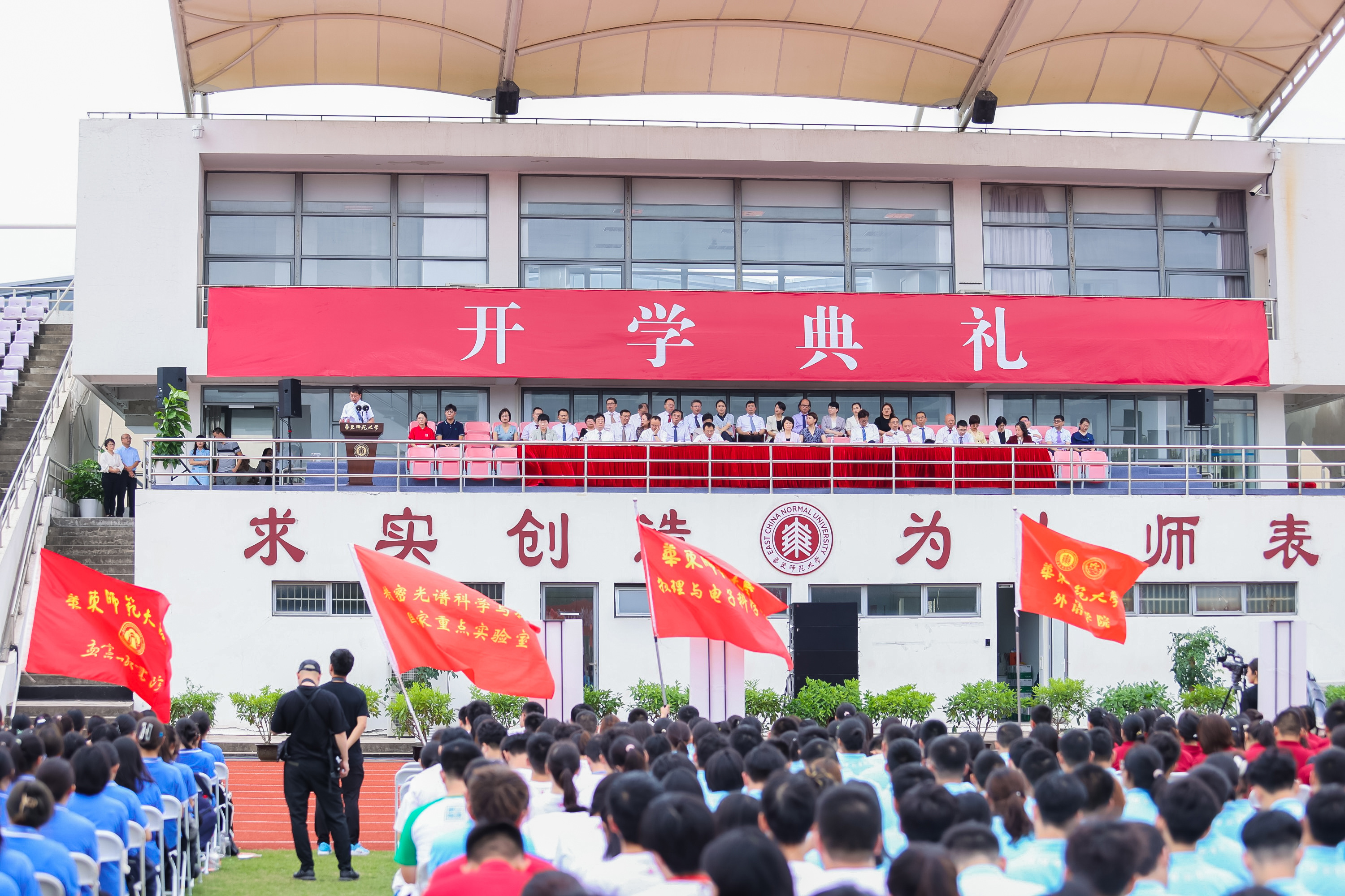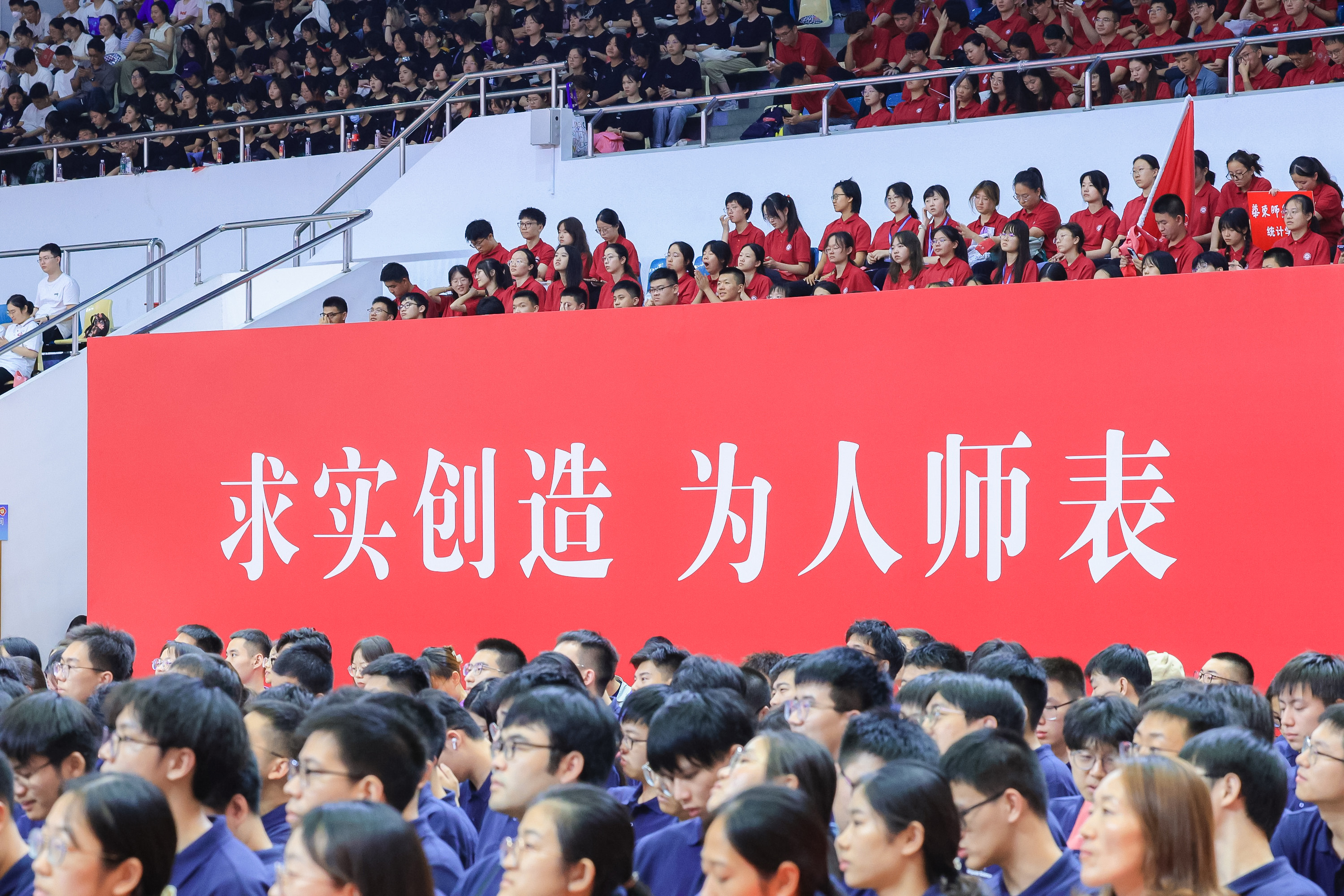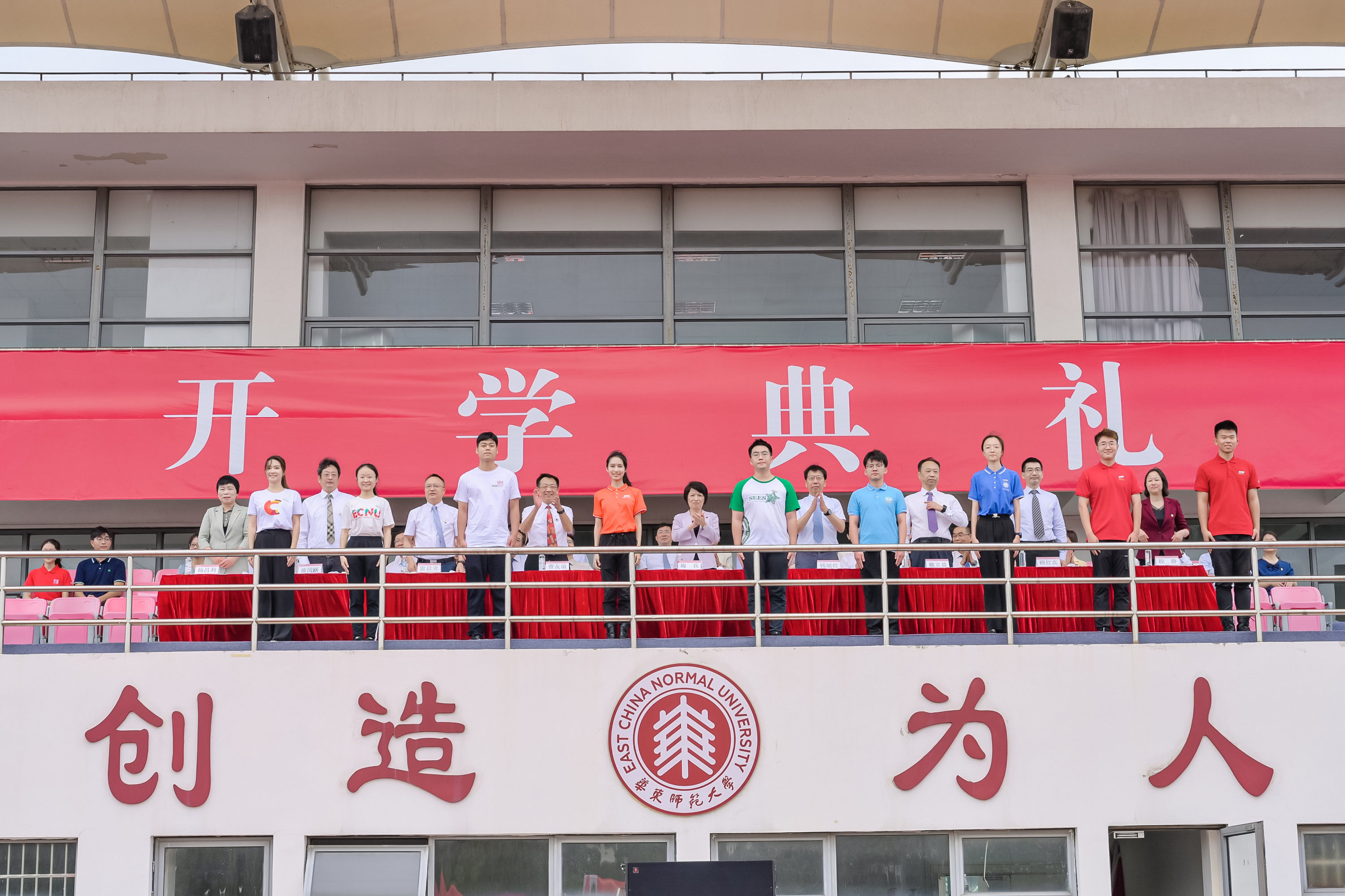 典礼上,校领导为新生代表授予校徽。校徽是华东师大人的集体身份象征,更是展示学校形象与文化的标识与名片。正式戴上校徽,不仅标志着新生们已成为师大学子,更意味着他们将担负起维护和树立学校形象的责任。
