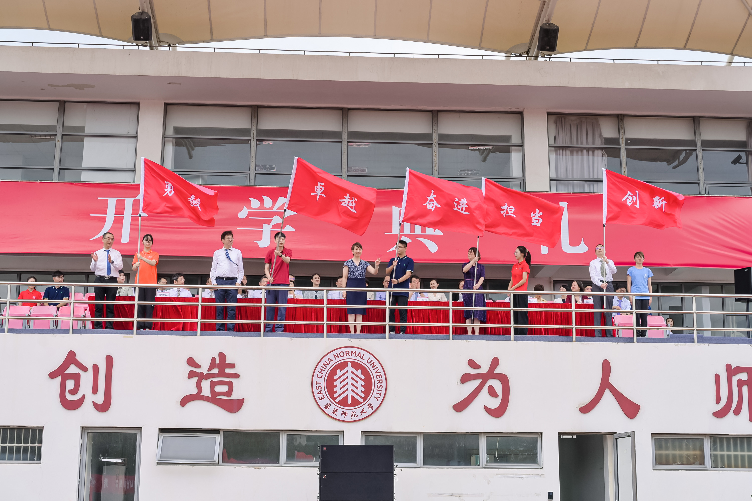 带着师长们的期望和祝福,2023级新生代表从教育前辈的手中接过代表“卓越、创新、勇毅、奋进、担当”精神的五面旗帜,立志在华东师大成为更好的自己。